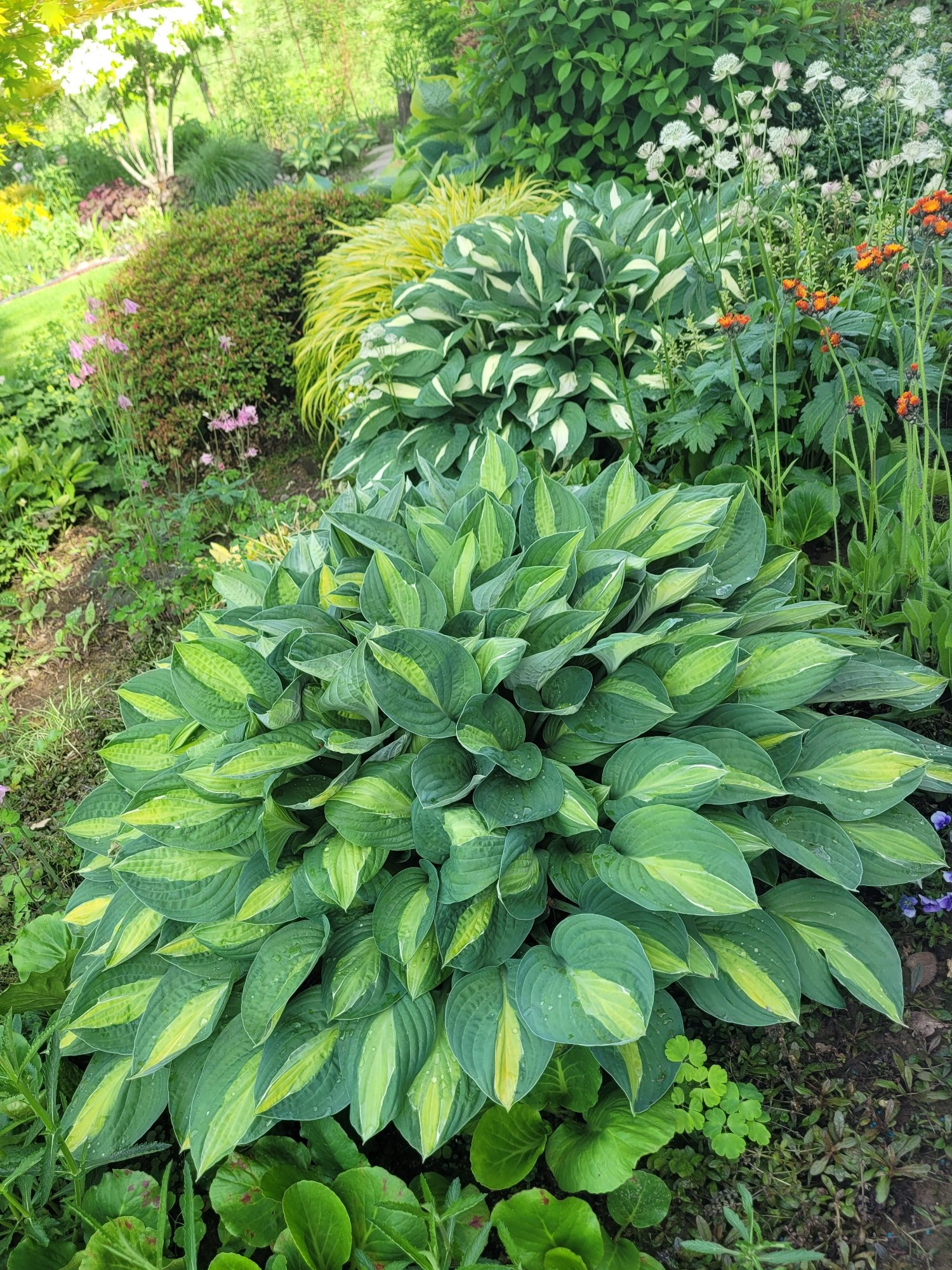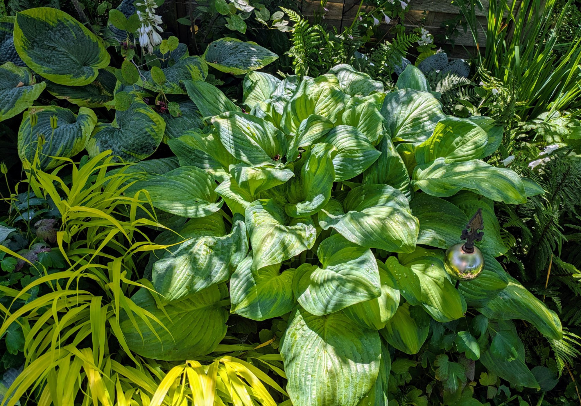 Oh je, hobab! Da würde ich mich sofort von meinen Hosta trennen und anderes pflanzen. Ich lege an mit Hosta 'Guacomole' und 'Frances Williams' und Hakonechloa macra 'All Gold'.