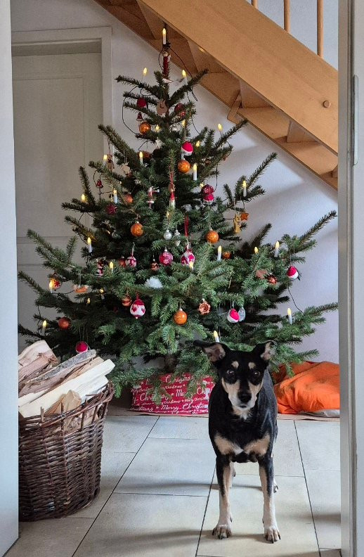 Unserer steht seit dem Einzug des Holzofens in den Wohnräumen auch im Flur, sonst wäre der schon nach 2 Tagen kahlgenadelt. Und weil unter der Holztreppe, und mit immer vielen vierbeinigen, stark schwanzwedelnden Mitbewohnern musste ich mich auch von meiner Abneigung gegen Elektrolichter verabschieden. Als wir noch große Hunde plus Katzen hatten, war der Baum noch an zwei Seiten festgebunden. Auch von essbarer Deko haben wir uns verabschiedet, denn Deutsche Doggen kommen für ein altbackenes Lebkuchenpferd oder eine Zuckerstange auch bis ganz an die Spitze, diverse Kollateralschäden inbegriffen.