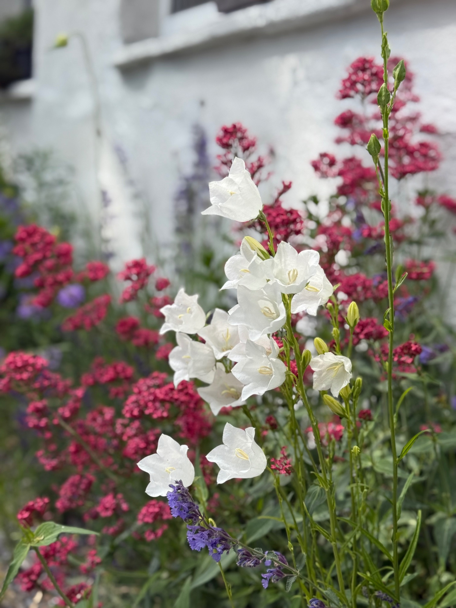 Hier auch Campanula. Im Hintergrund Digitalis und Geum.