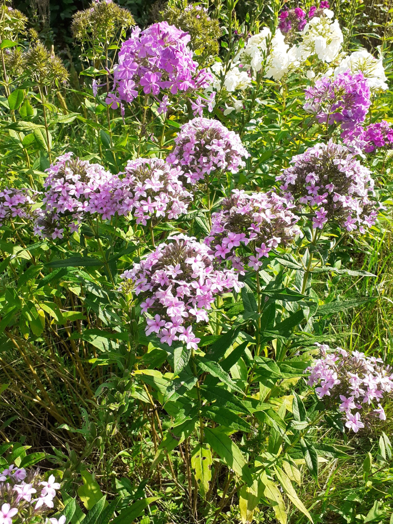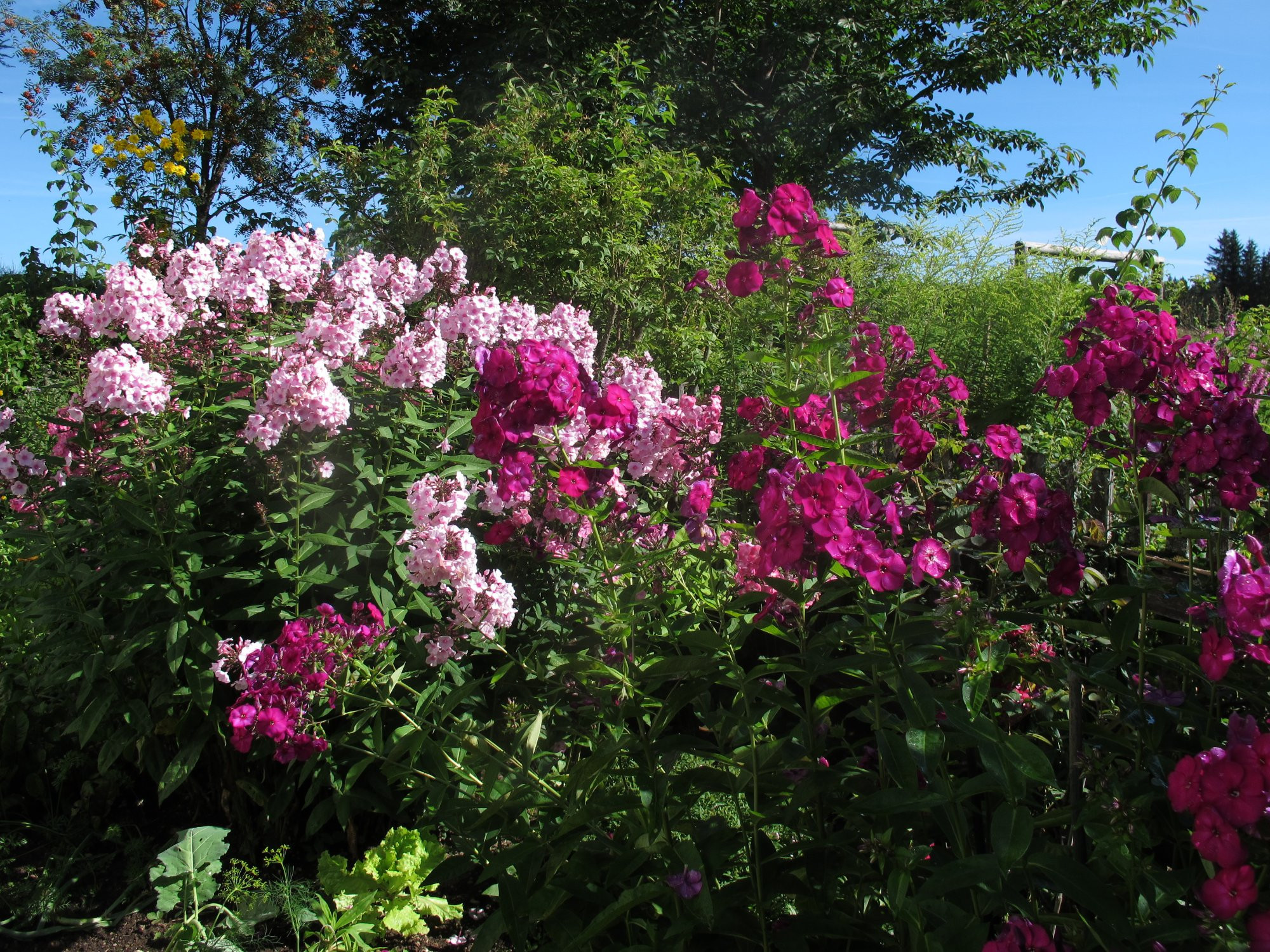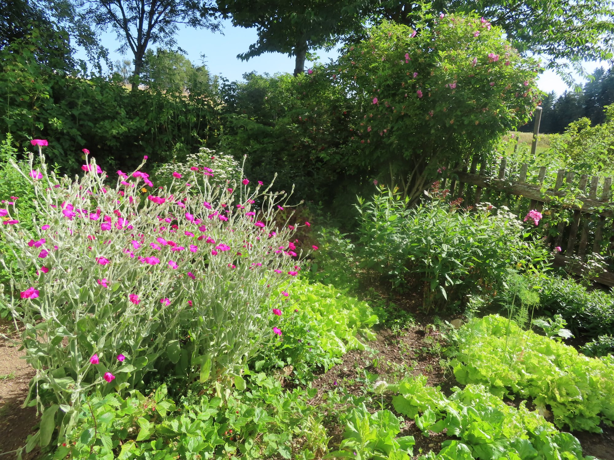 Nelken, Erdbeeren, Salat, Rose 'Kaiserin des Nordens', abgeblüht, Ribisl, Mutterkraut, Phlox...