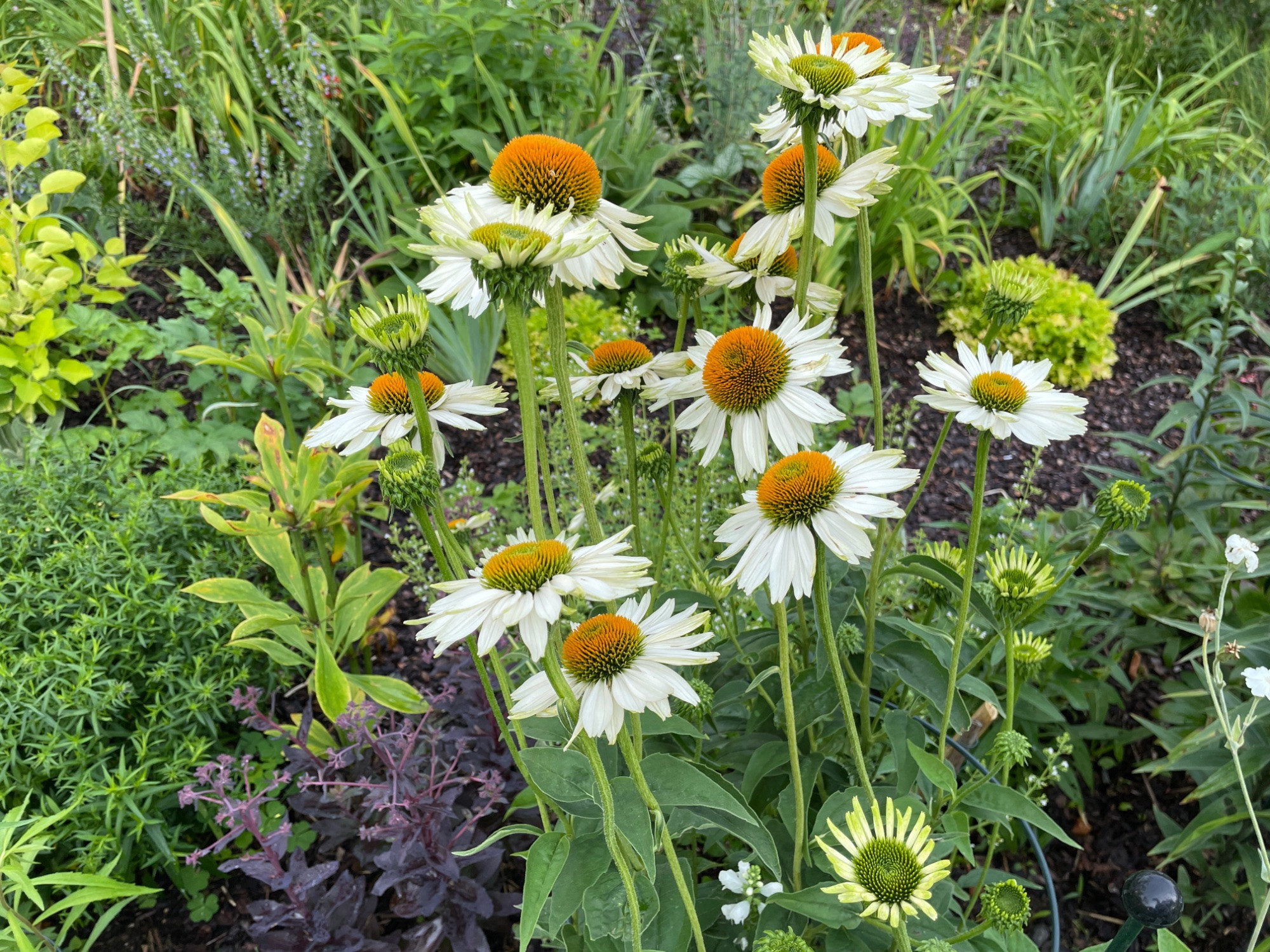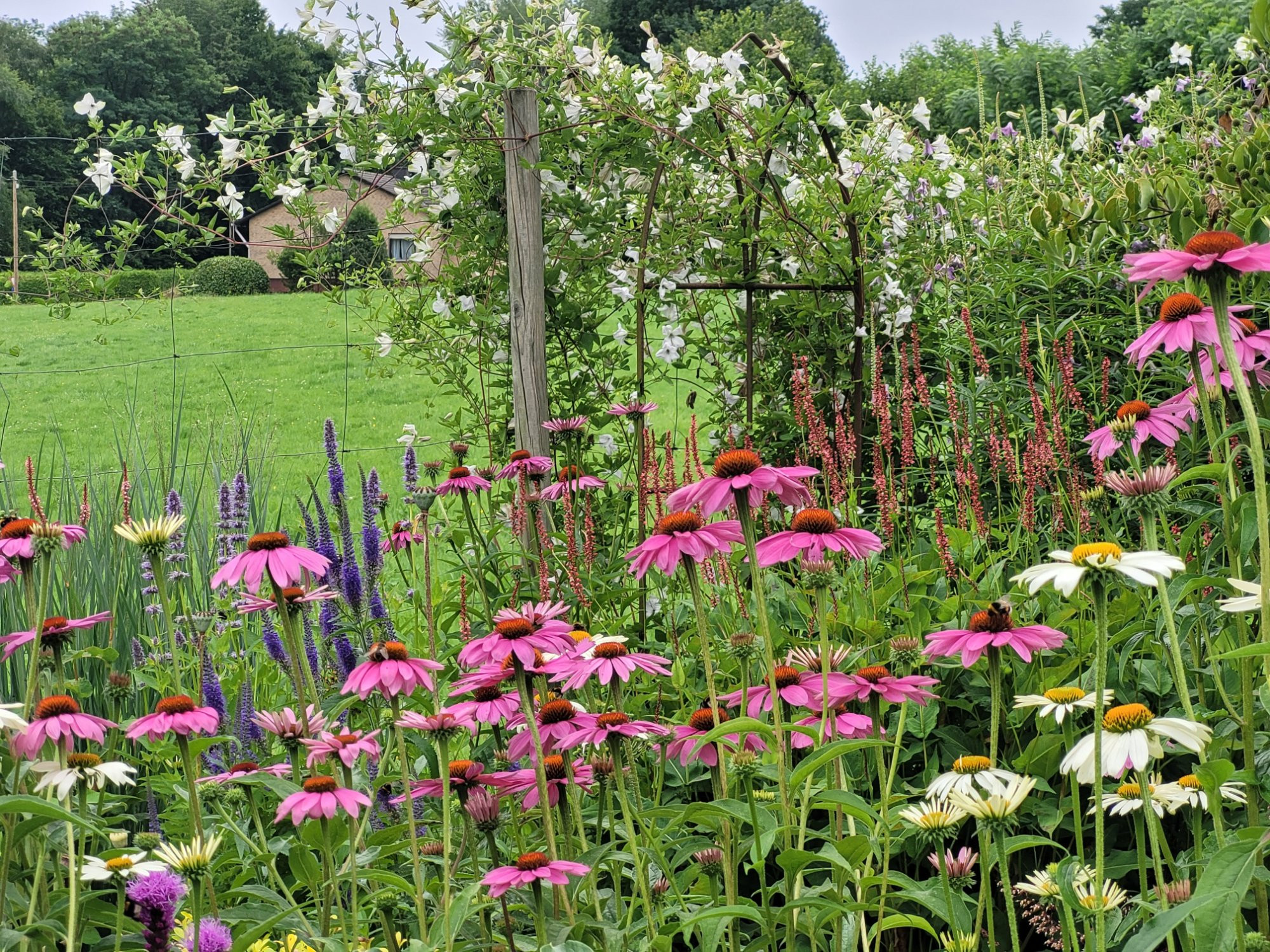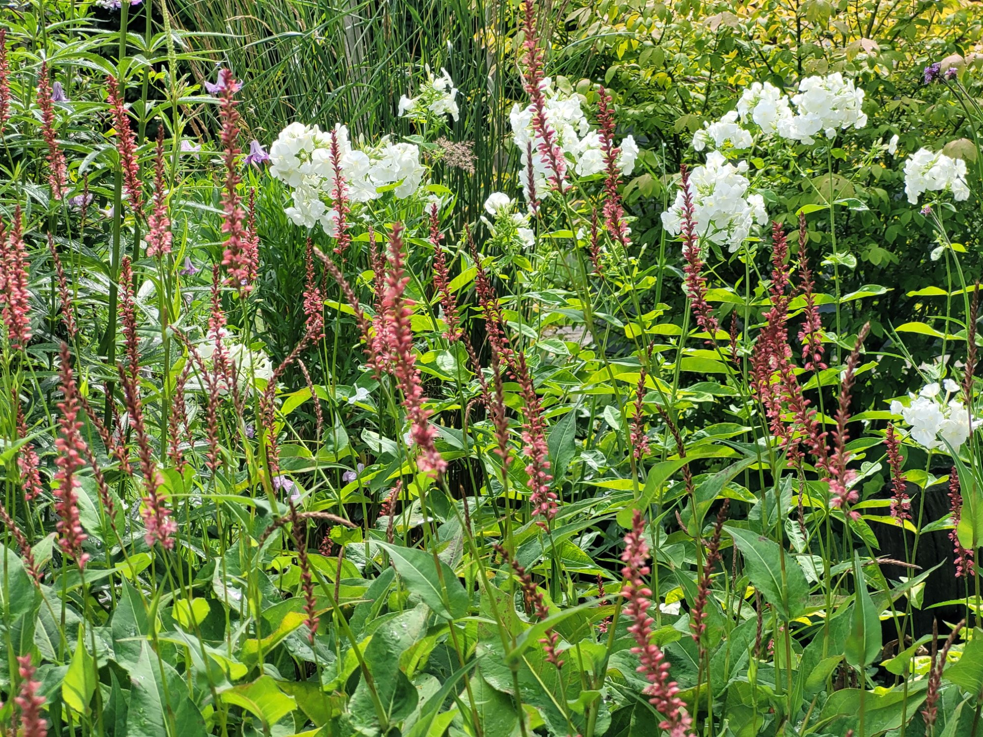 Nelken, Erdbeeren, Salat, Rose 'Kaiserin des Nordens', abgeblüht, Ribisl, Mutterkraut, Phlox...