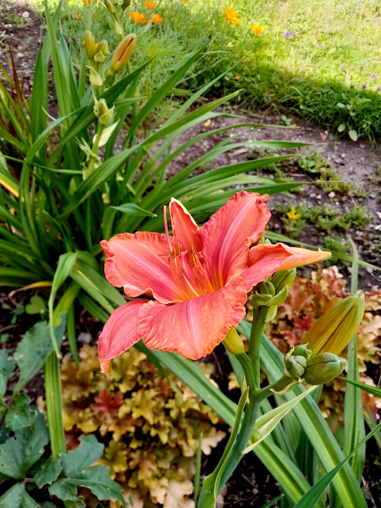 Taglilie, Heuchera, Dahlienlaub, Sedum acre.