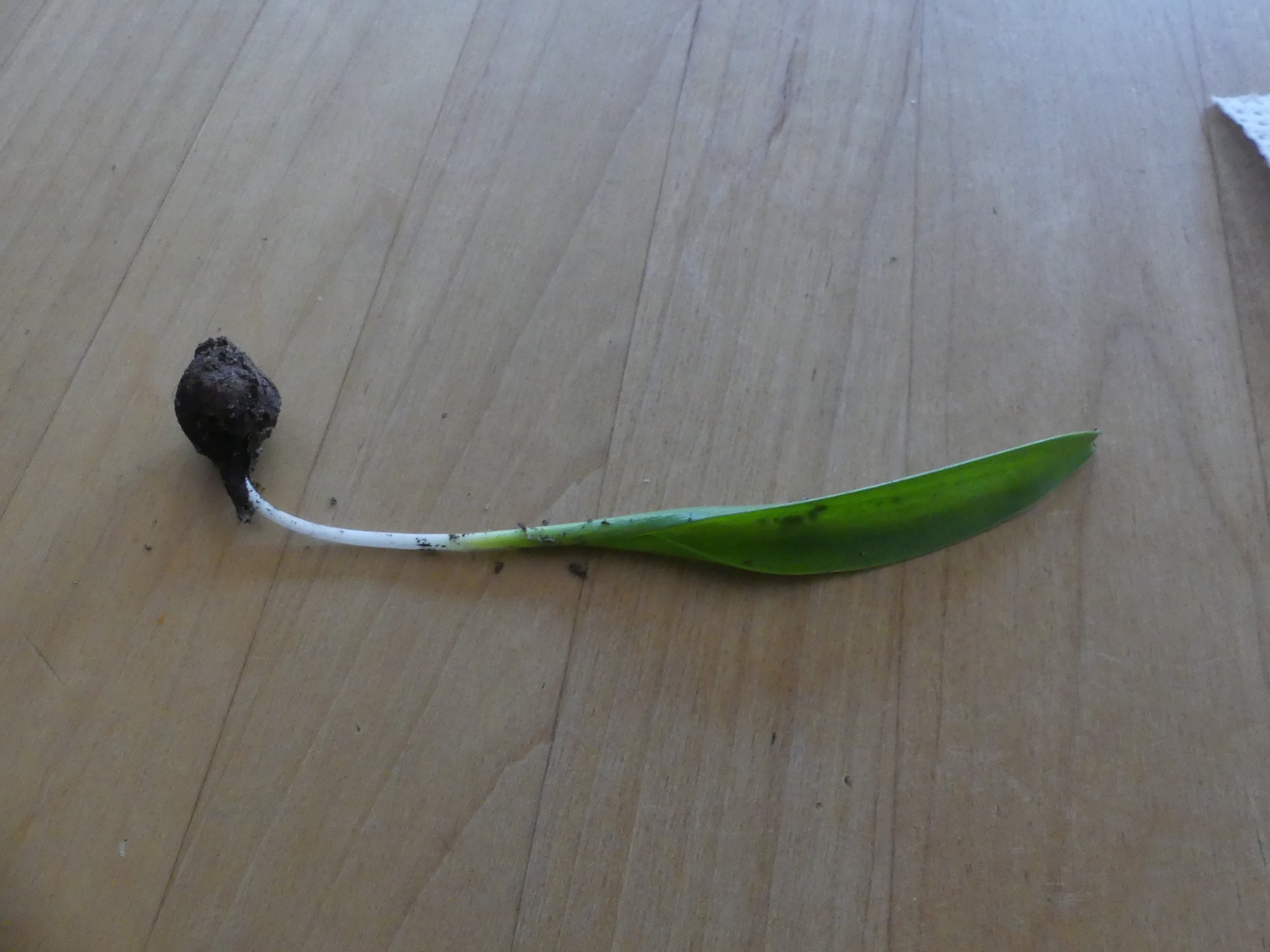 Im Dezember finde ich diese Blätter. Im Frühjahr ziehen sie wieder ein, ohne geblüht zu haben. Was kann das sein? Ich habe mal ein Blatt ausgegraben; unten dran ist eine Zwiebel. Blühfaule Tulpen?