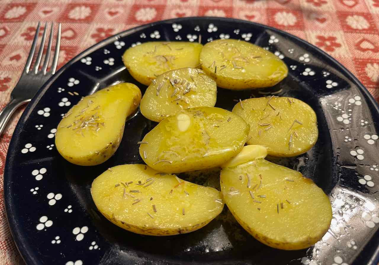 Grüner Spargel, mit Knoblauch in Butter und Olivenöl gebraten und mit Balsamico und Weißwein abgelöscht sowie Drillingskartoffeln gedämpft und mit Butter und Rosmarin zum Chardonnay 2019 "La Chantenelle".