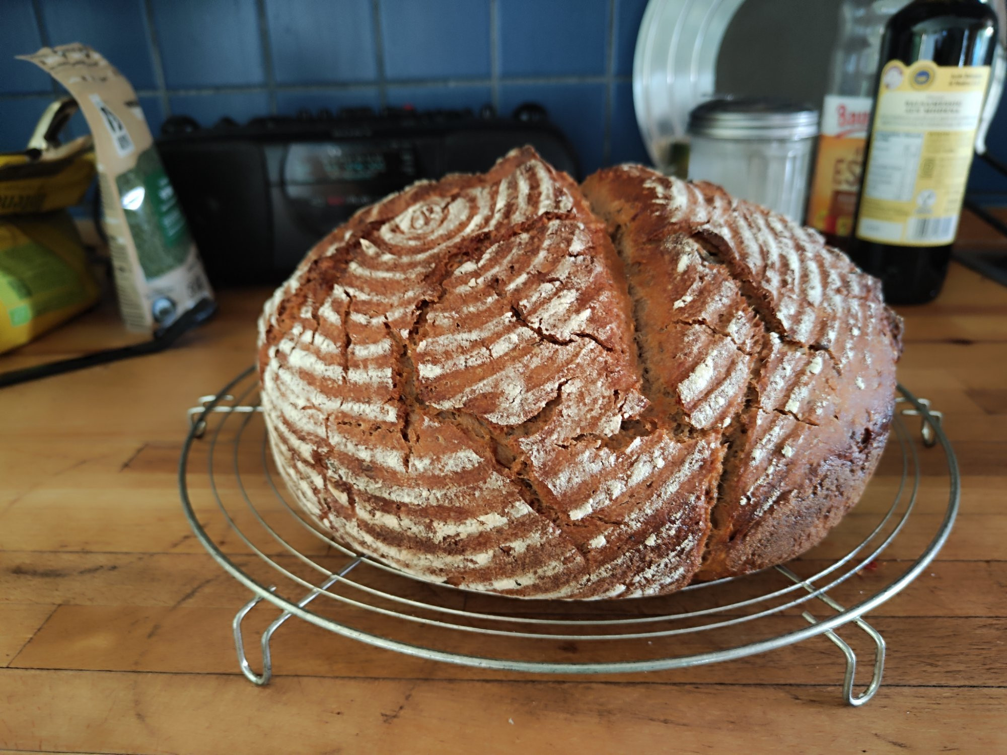 Ich habe grad zwei Laibe im Ofen, eines ein reines Roggenbrot, das andere ein Roggen-Dinkel-Vollkornbrot mit viel Körnern (und Vorteig, Brühstück und Kochstück). Letzteres mache ich, glaube ich, nur solange, bis die dafür gekauften Roggen- und Emmerkörner verbacken sind. Ist schon aufwändig!