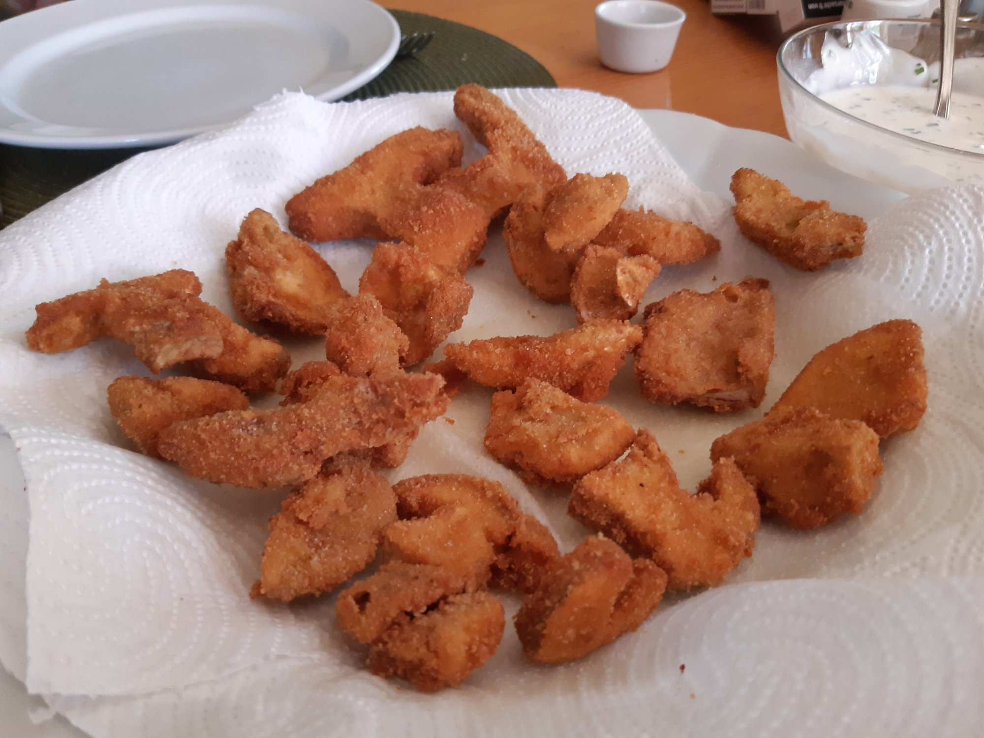 Ich habe heute Pilze paniert. In Ö wird Vieles paniert. Schmeckt besser, weil der eigene Saft erhalten bleibt, egal ob Fleisch oder eben Pilz