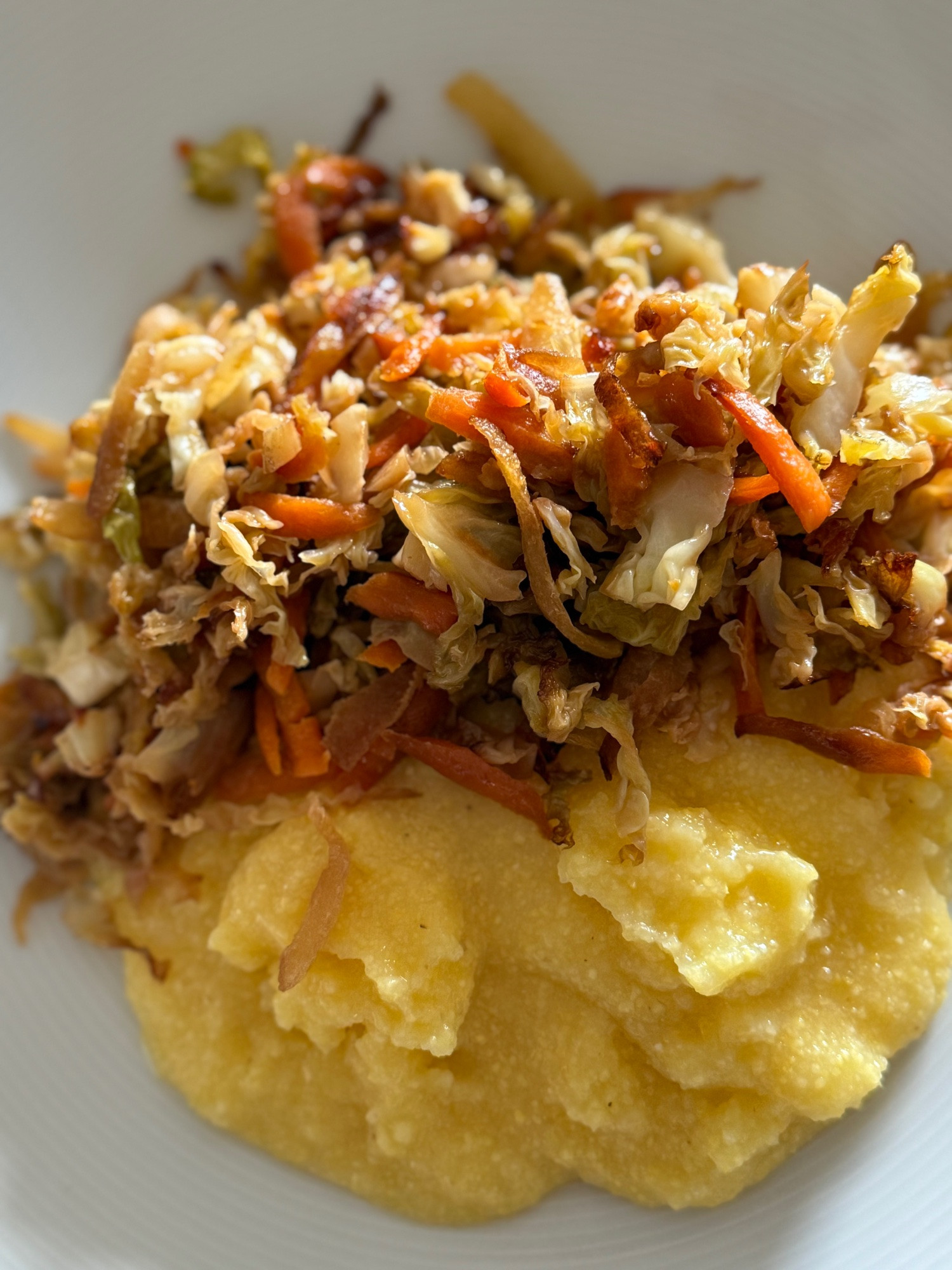 Gestern habe ich mir Polenta gekocht. Dazu gab angebratenen Wirsing mit Karotten, mit Sojasoße abgelöscht und mit Butter verfeinert.