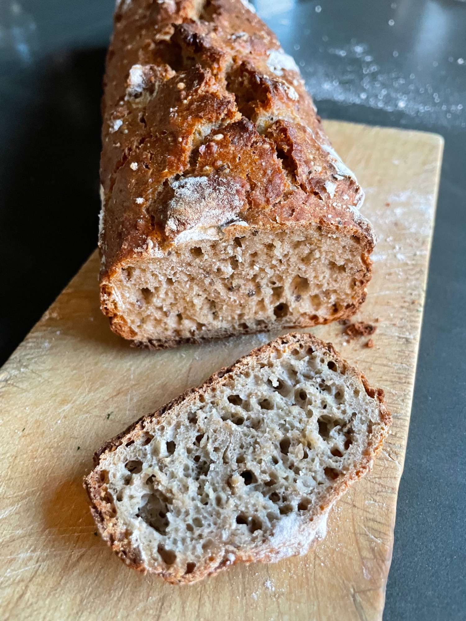 Gestern hatte ich einen Teig mit Roggenvollkorn, Dinkel, Weizenmehl und Haferflocken angesetzt und heute in der Pastetenform gebacken. Die Mischung gefällt mir.