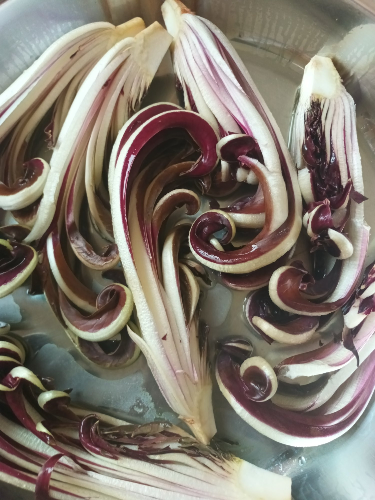 Gemüse machen den Winter fröhlich. Hier mal Trevisano, der gedämpft mit Parmesan bald auf den Tellern landet. Drunter frischer Peperoncino, scharf, aber nicht zu scharf. Dürfte für eine Weile reichen.