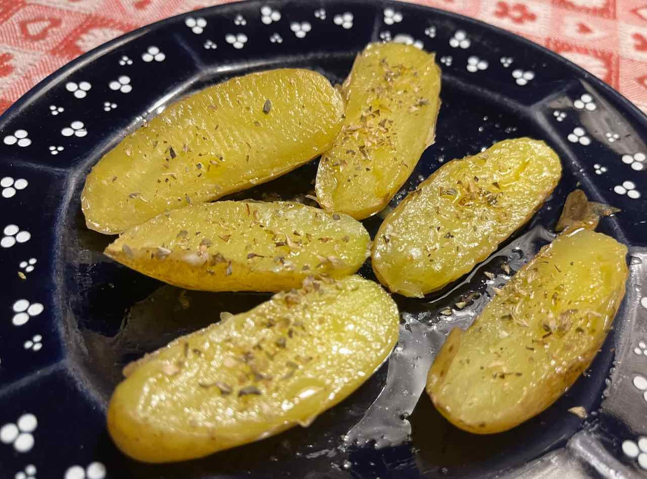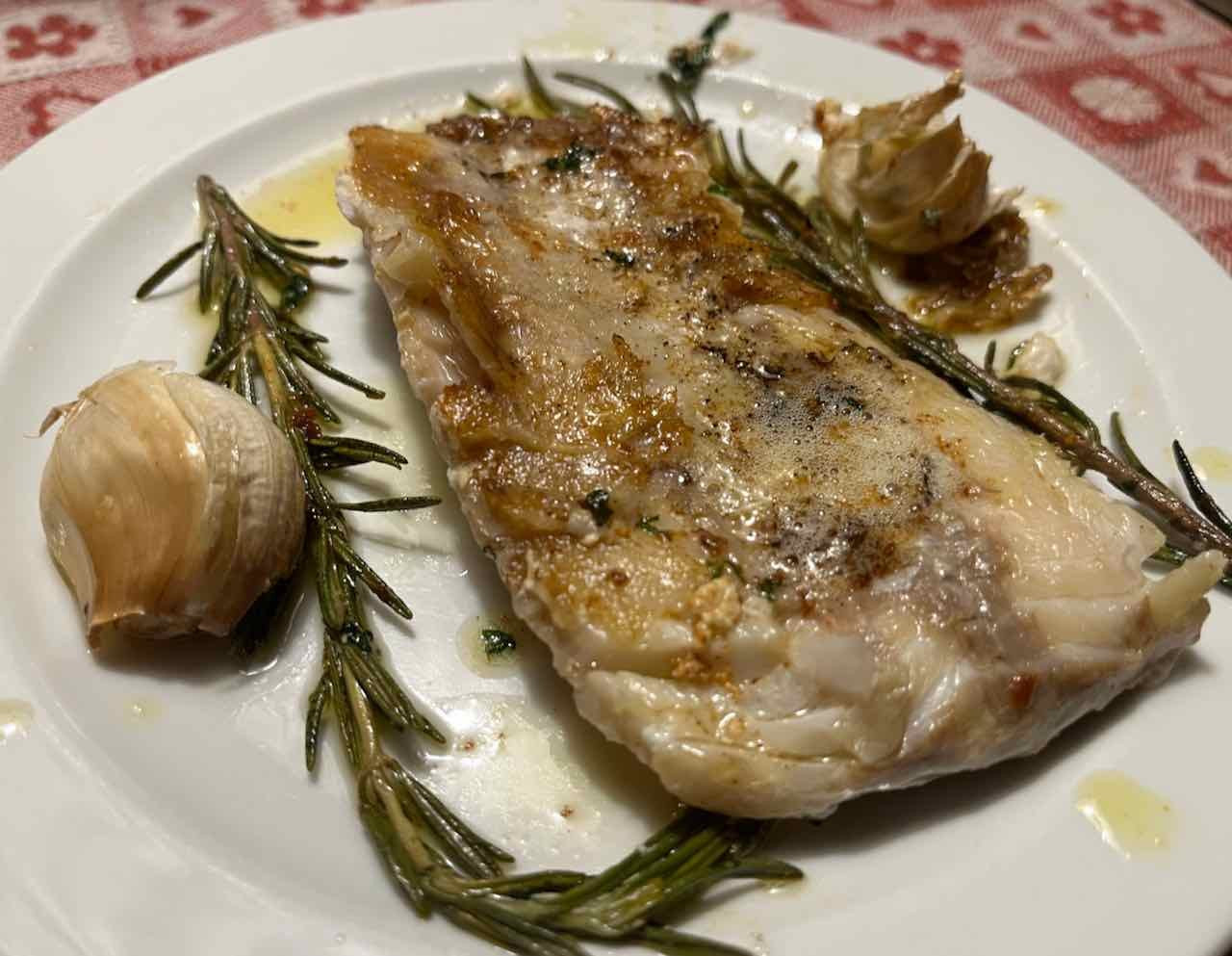 Rotbarschfilet, leicht meliert und mit Olivenöl, Butter, Rosmarin, Koriander und Knoblauch gebraten und mit Zitronenbutter und Thymian übergossen sowie Drillingskartoffeln gedämpft und mit Butter und Oregano serviert zum Chardonnay 2016 "Elephant Hill" aus Neuseeland