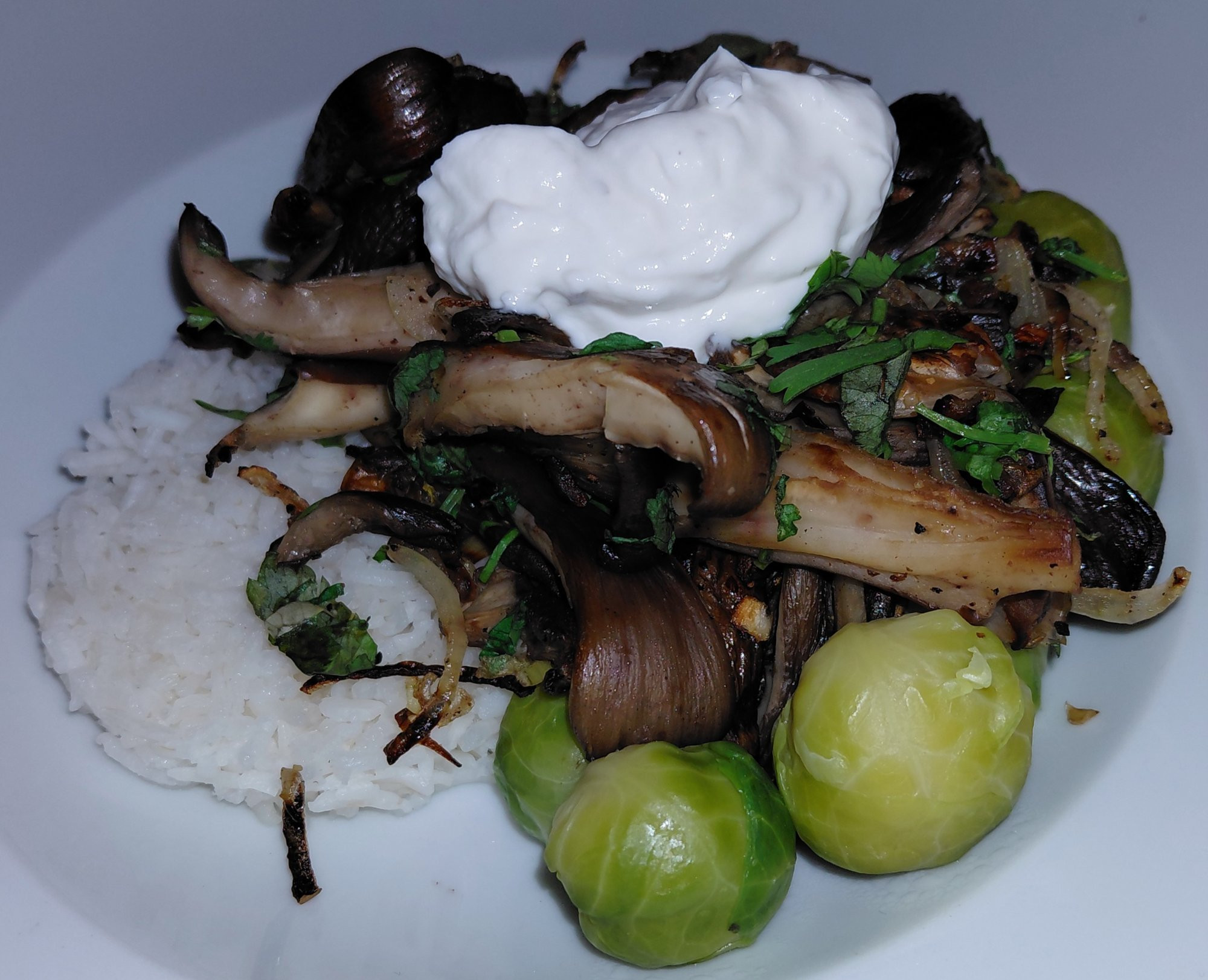 Die gab's heute mit Rosenkohl, Basmati und Zwiebelquark, dazu Spitzkohl-Zuckerhut-Salat