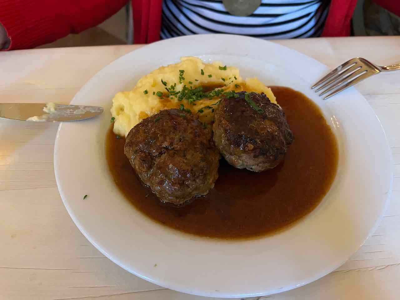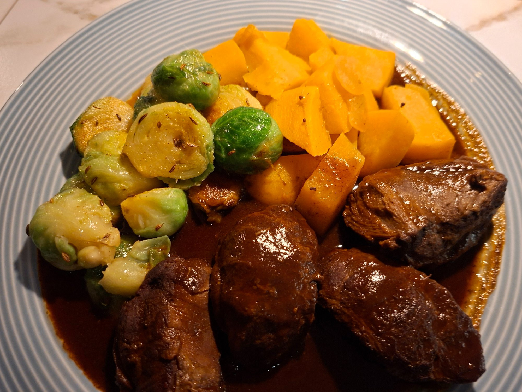 Geschmorte Schweinsbäckchen mit Steckrübenragout und Rosenkohl. Im Hotelrestaurant. Davon kannte ich bisher nur den Rosenkohl näher.