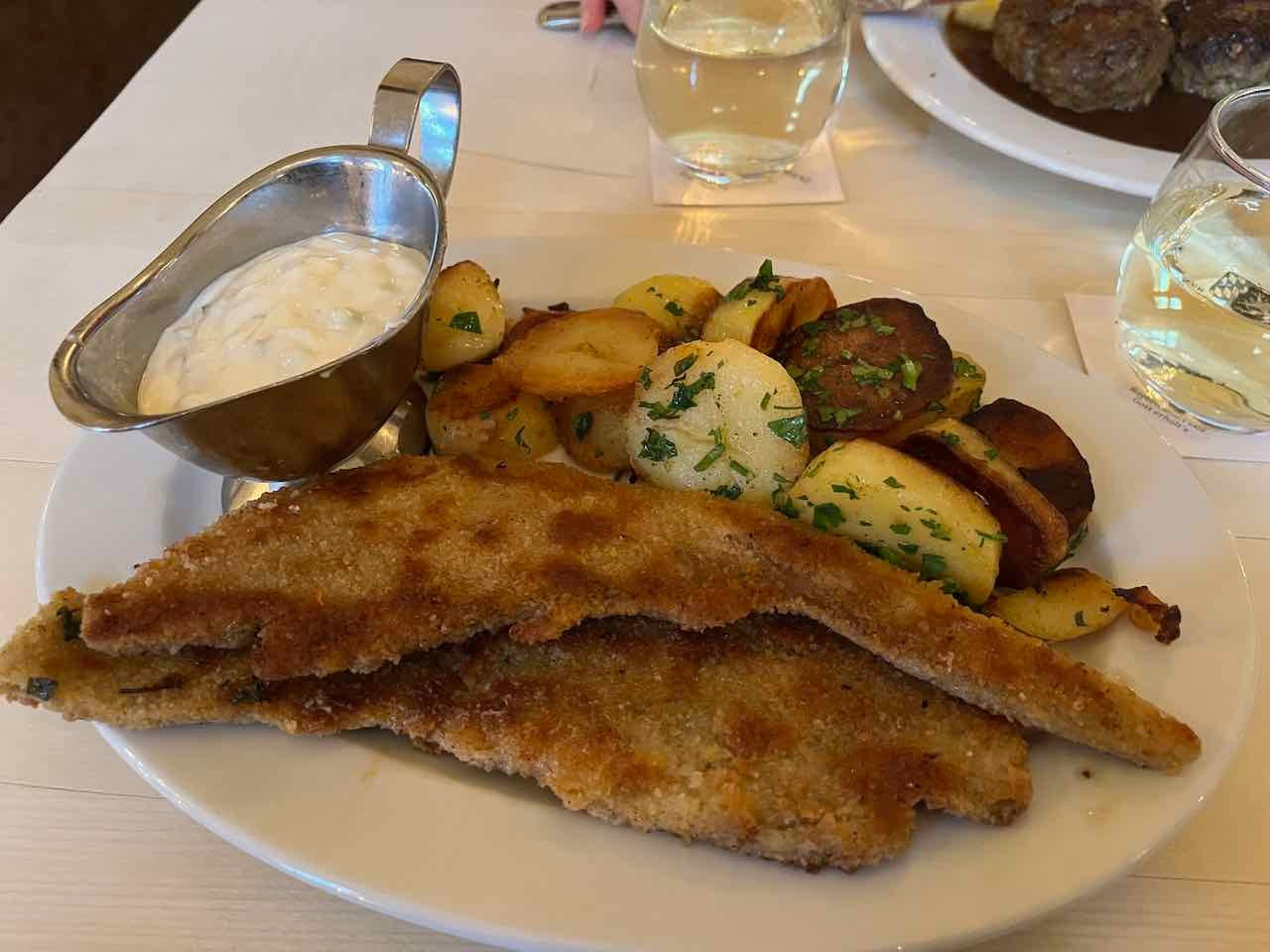 Kalbspflanzl mit Karoffelsalat sowie paniertes Kalbszüngerl zum Pfälzer Riesling im Resttaurant
