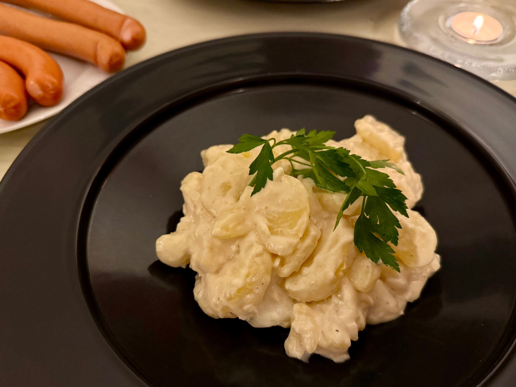 kartoffelsalat allameng nach dem vor wenigen tagen im tagesspiegel veröffentlichten geheimen rezept von rogacki, dazu zweierlei biofleisch-wiener (schwein und kalb)