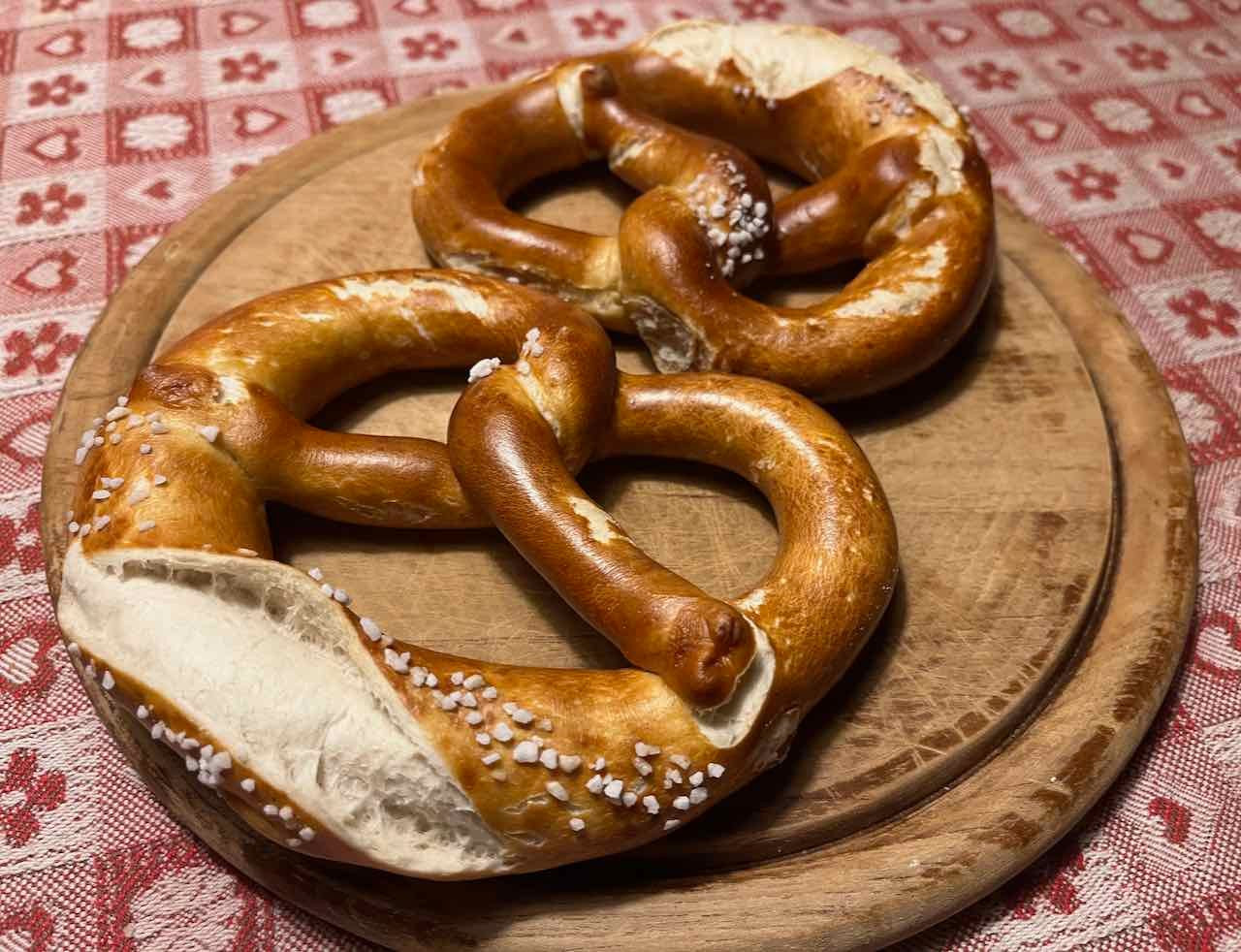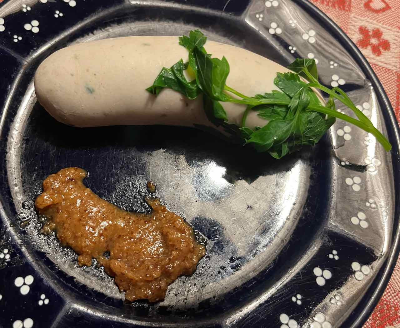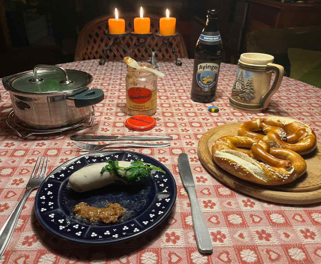 Hauptspeise ein Paar Weißwürste mit Händlmaiersenf sowie Brezn, von der Regel abweichend zum "Winterbock" aus Aying