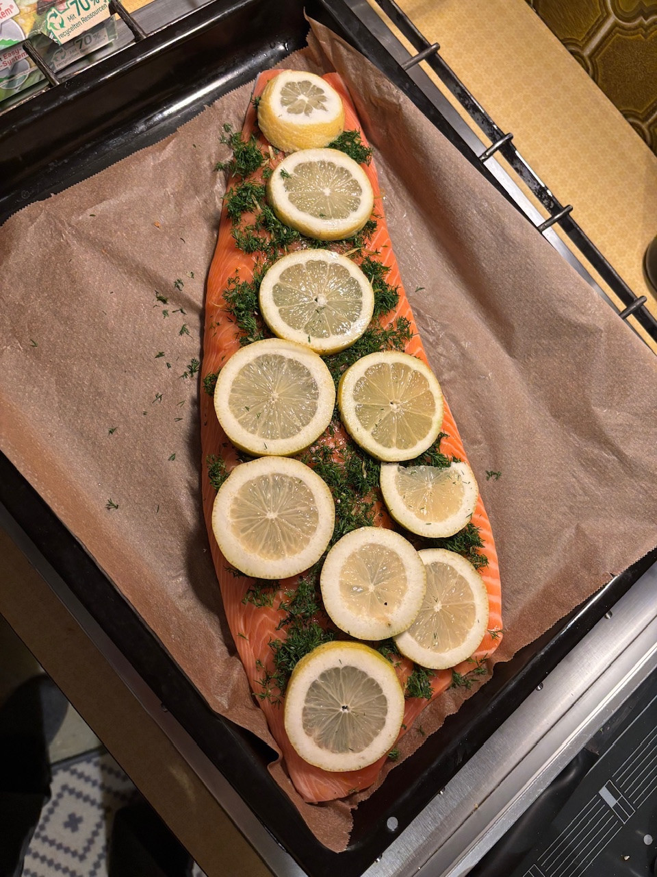 Ich habe in der Küche meiner Mutter gekocht, was immer schwierig ist, wenn man das Backrohr nicht so gut kennt. Aber der frische, irische Biolachs (Aquakultur) ist sensationell gut geworden. Dille, Zitronenschale und -scheiben, S&P. Leider nur ein Vorher-Foto. Mit Erdäpfelsalat und Avocadocreme.