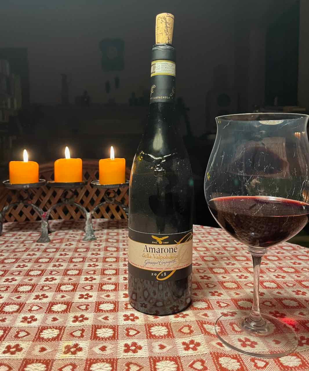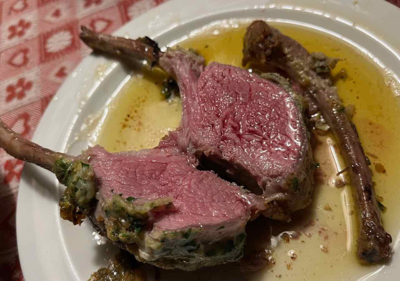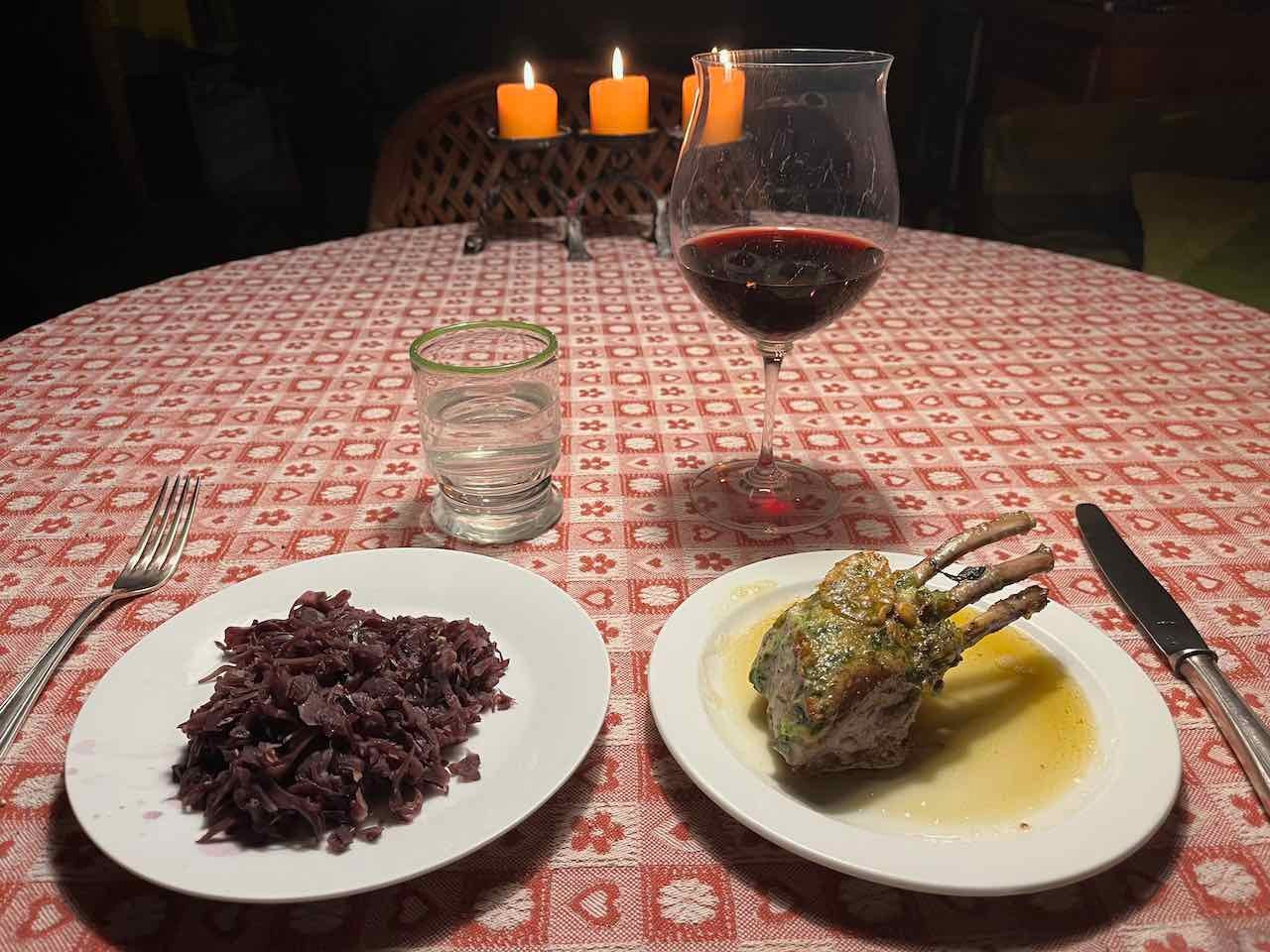 Lammkarree mit Kräuterkruste in der Pfanne mit Knoblauch und Butterschmalz gebraten sowie Blaukraut mit Kräutern und Ingwer über Portweinschorle gedämpft zum Amarone della Valpolicella 2018