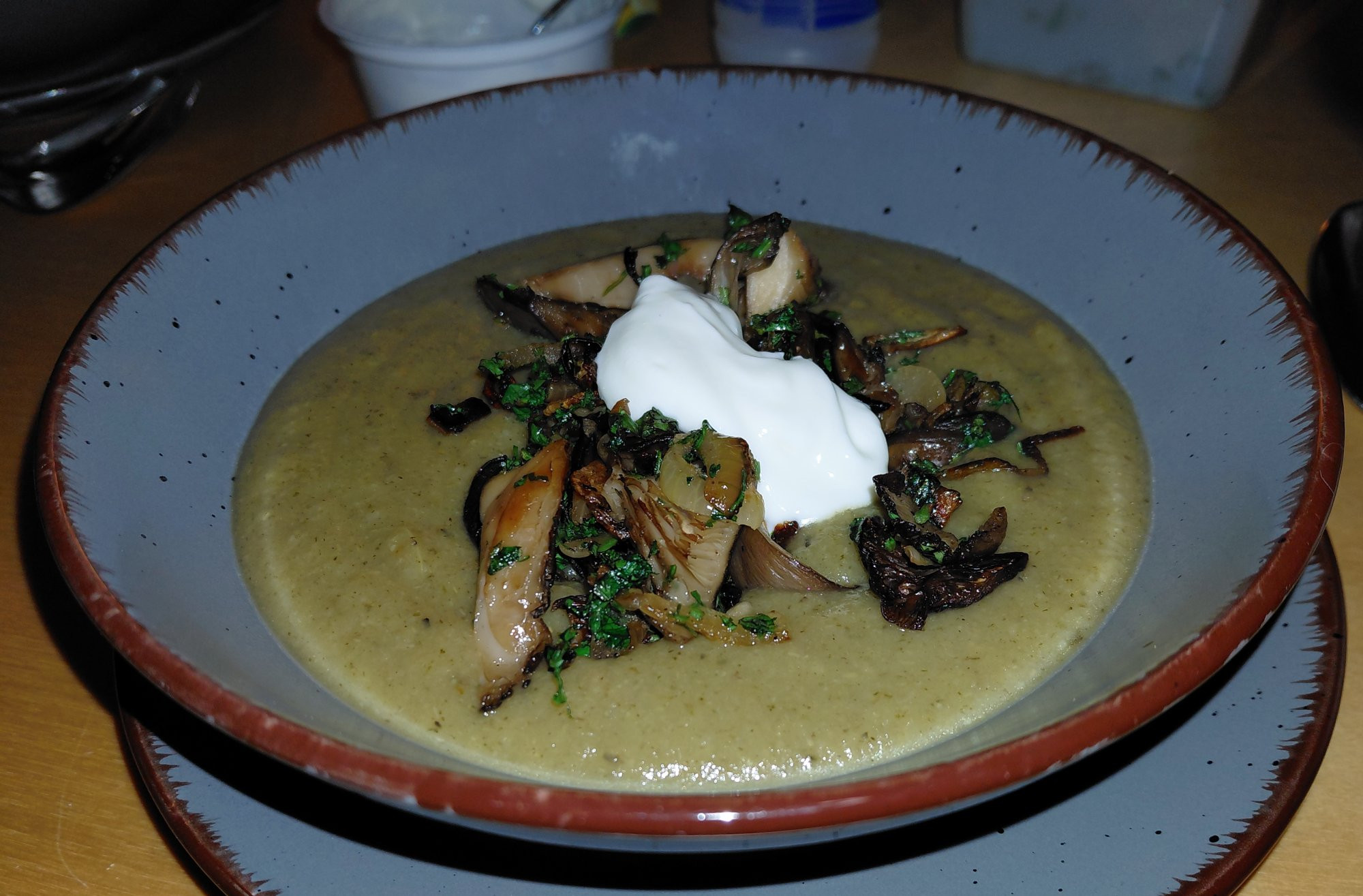 Hier gab's vorgestern Rosenkohlsuppe mit Austernpilzen, die wir in unserem Garten gefunden haben.