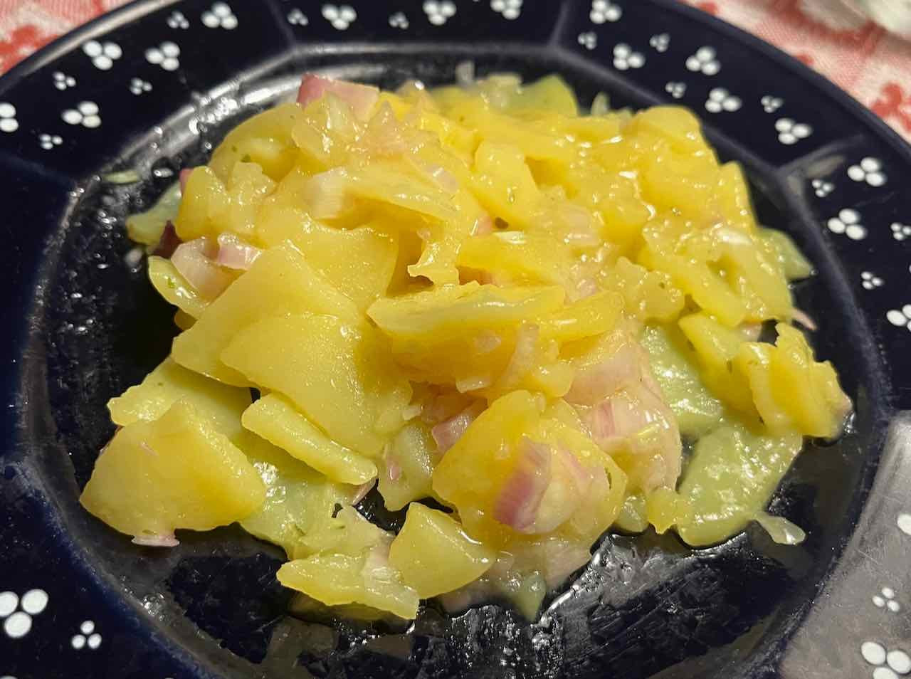 Rotbarschfilet, leicht mit Dinkelgries bestreut, mit Butter und Knoblauch gebraten und mit Zitronenbutter-Soße sowie lauwarmer Kartoffelsalat mit Schalotten zum Chardonnay 2016 "Elephant Hill" aus Neuseeland