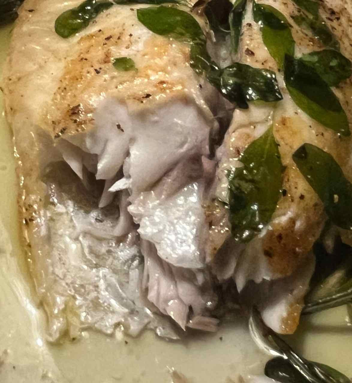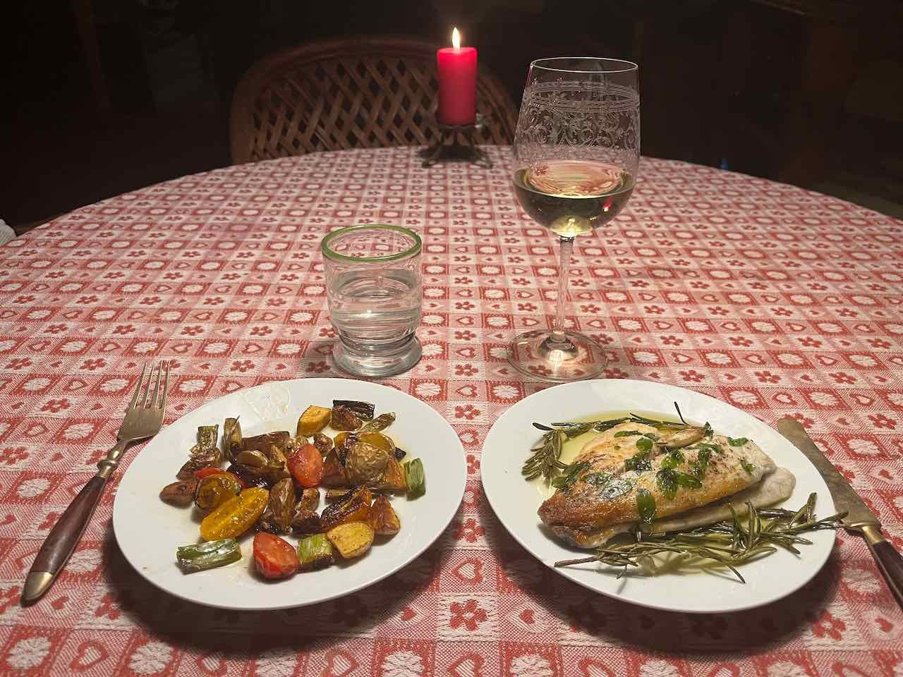 Doradenfilet mit Knoblauch und Rosmarin und mit Majoran-Blättern gebraten sowie rustikale rohe Kartoffelschnitten, gelbe und rote Kirschtomaten, Frühlingszwiebeln, zum Riesling 2024 aus der Pfalz.