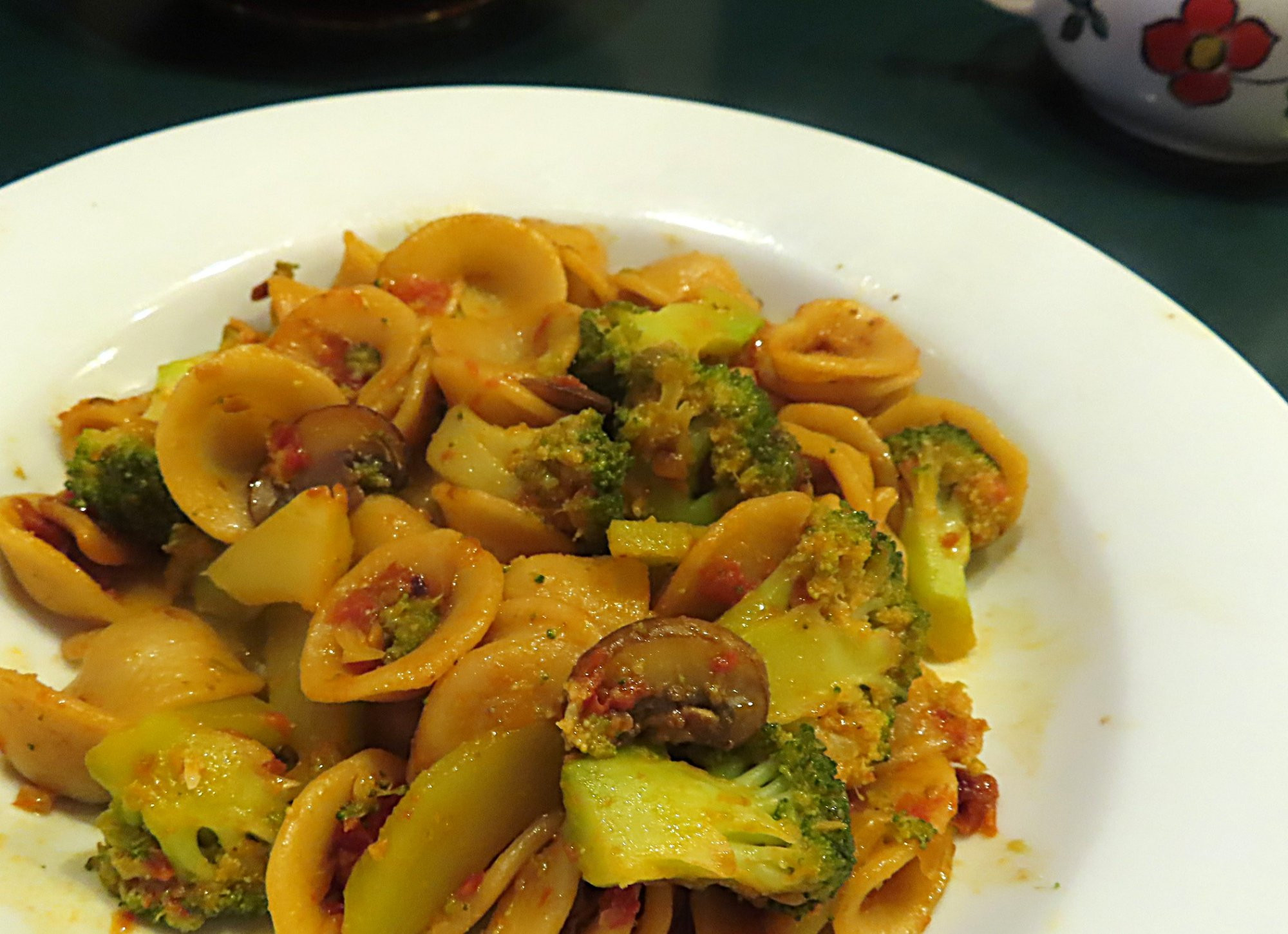 Hier gab es heute Orecciette mit Brokkoli, braunen Champignons, Tomaten (Dose und Getrocknete), Zwiebel, Knoblauch und Parmesan.
