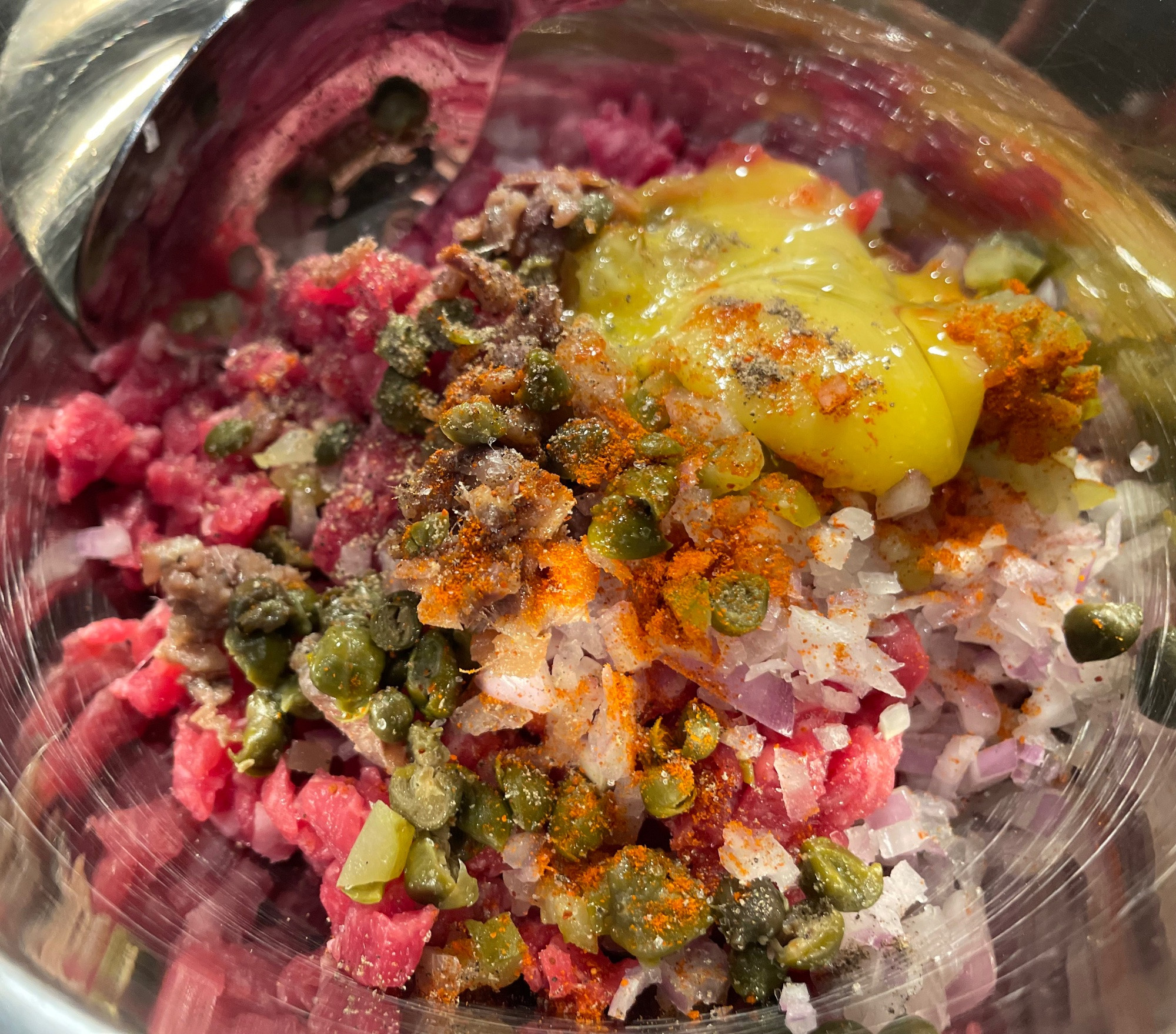Dazu gab es mit Kapern, Sardellen, Gürkchen, Schalotten, Senf, Eigelb, Salz und Pfeffer angemachten Tartar.