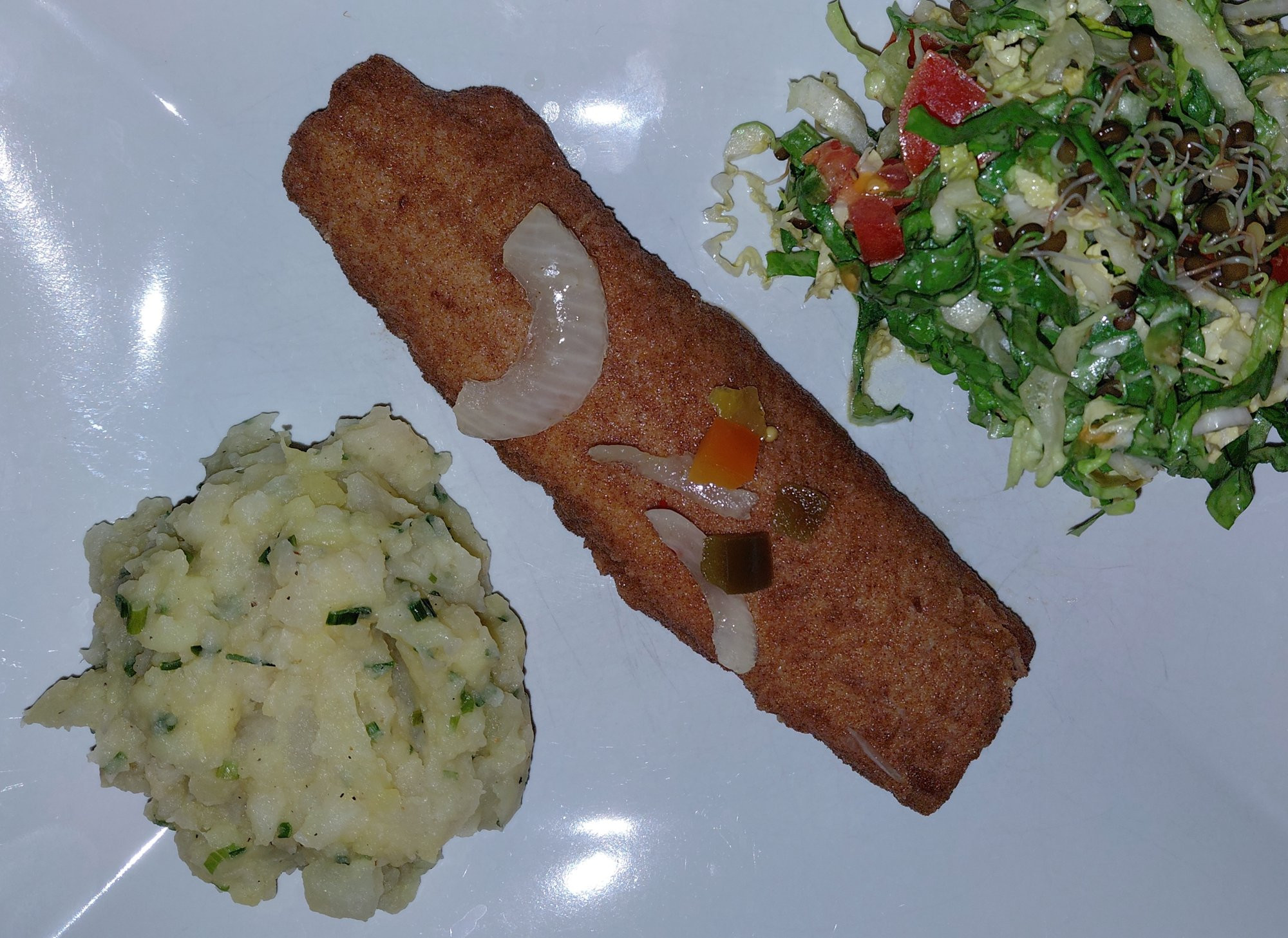 Brathering mit Kartoffel-Kohlrabi-Sellerie-Stampf und Salat