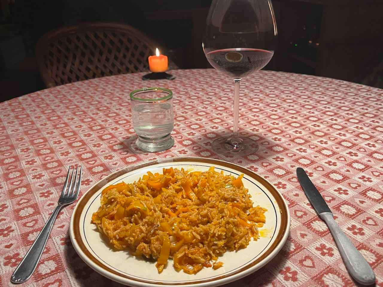 Paprika-Reis-Pfanne: Basmatireis mit Butter und Reisparfüm gedämpft, zweifarbige Spitzpaprika in Streifen geschnitten, mit weißer Zwiebel, Knoblauch, Paprikapulver, Tomatenmark, Senf und Thymian gewürzt zum Saperavi Tavkveri 2017 aus Georgien.