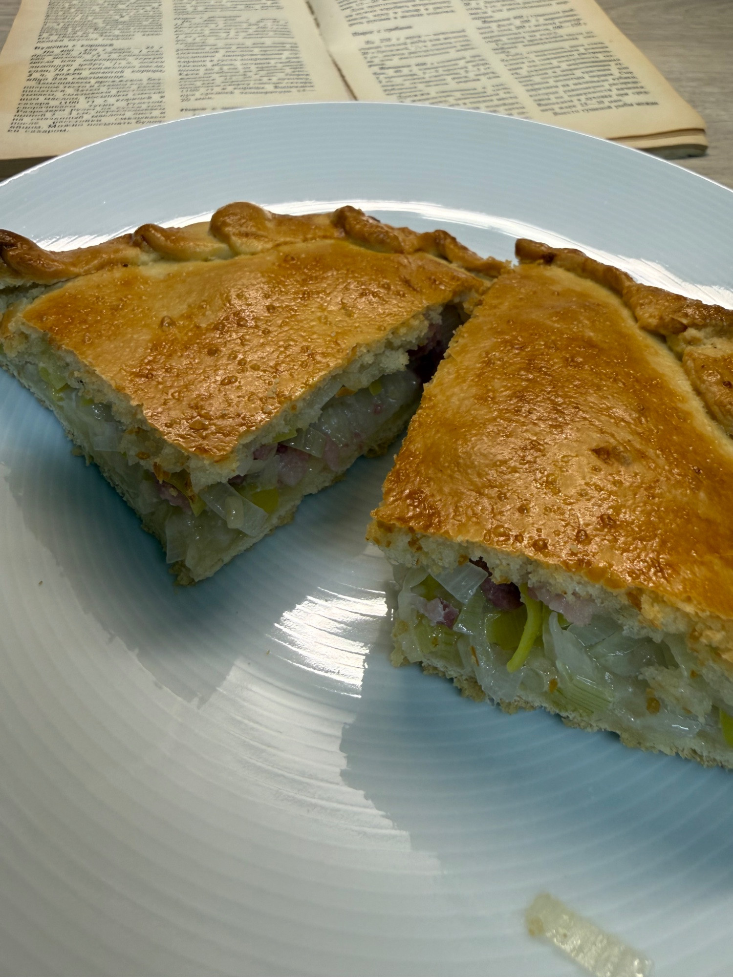 Und mir ist der Teig übrig geblieben. Ich habe dann Füllung aus Chinakohl, Lauch und Speck für den Kuchen gemacht. Von der Füllung ist zu viel übrig geblieben. Ich habe noch Steckrübe, Karotten und Kartoffel geschnippelt und Süppchen gekocht