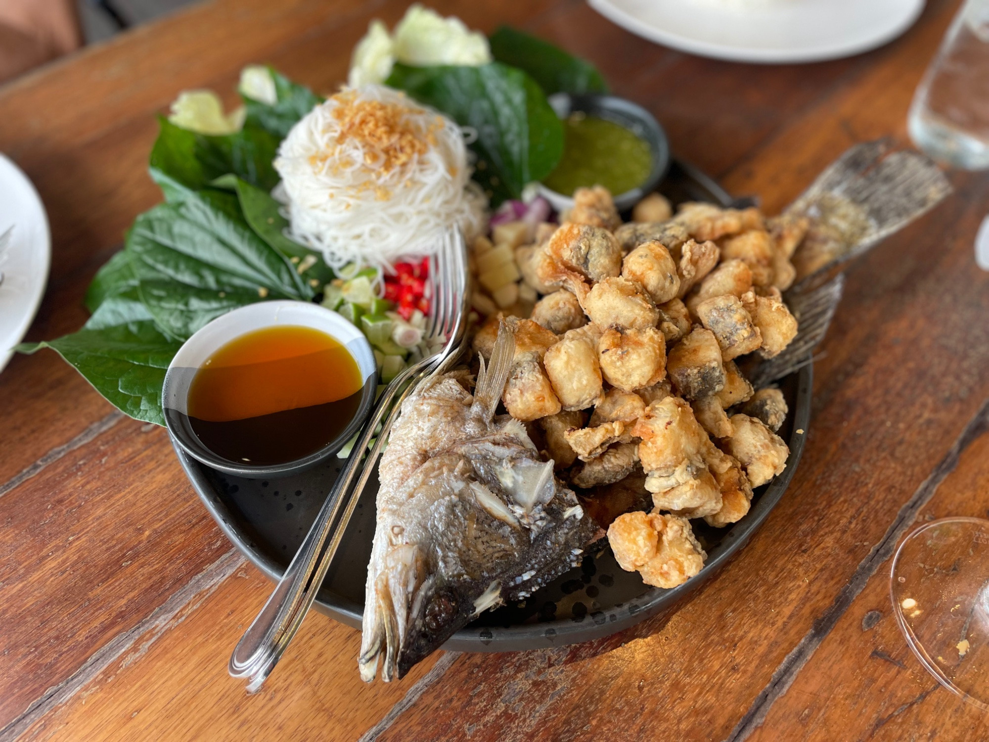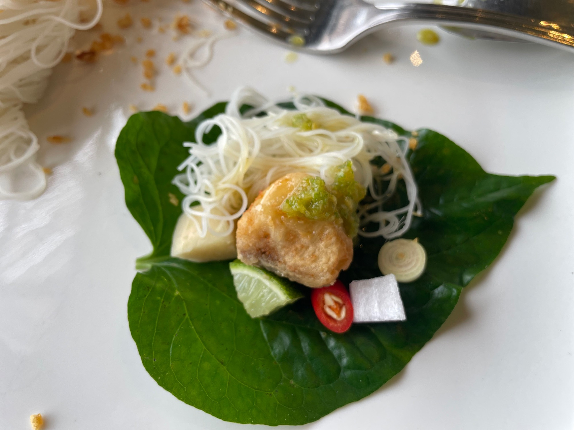 Eine wunderbare Variante von Miang Kham mit frittierten Fischstücken und zusätzlich Nudeln als Beilage beziehungsweise Füllung. Dazu zweierlei Saucen, eine aus PalmzuckerSirup mit Fischsoße die andere aus Koriander, Limettensaft, Ingwer und grünem Chili. Das werde ich auf jeden Fall zu Hause versuchen, nach zu kochen. Bei den Beilagen für die Füllung war hier auch Zitronengras dabei.