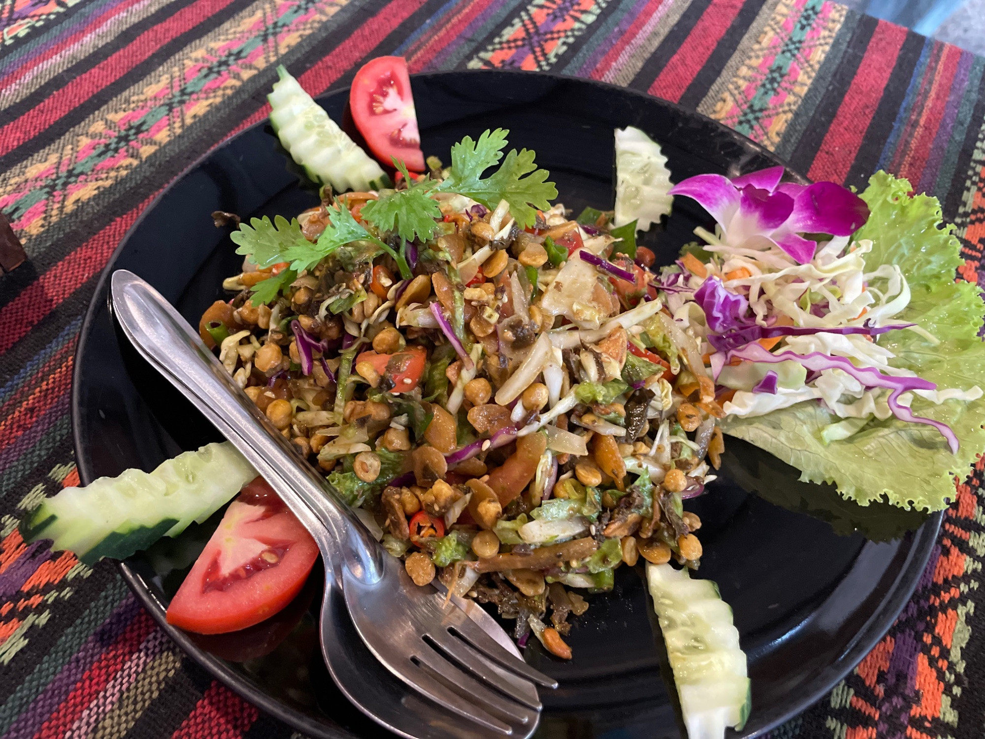 Jetzt sind wir in Chiangmai und hier haben wir gestern einen köstlichen Tee Blattsalat gegessen.