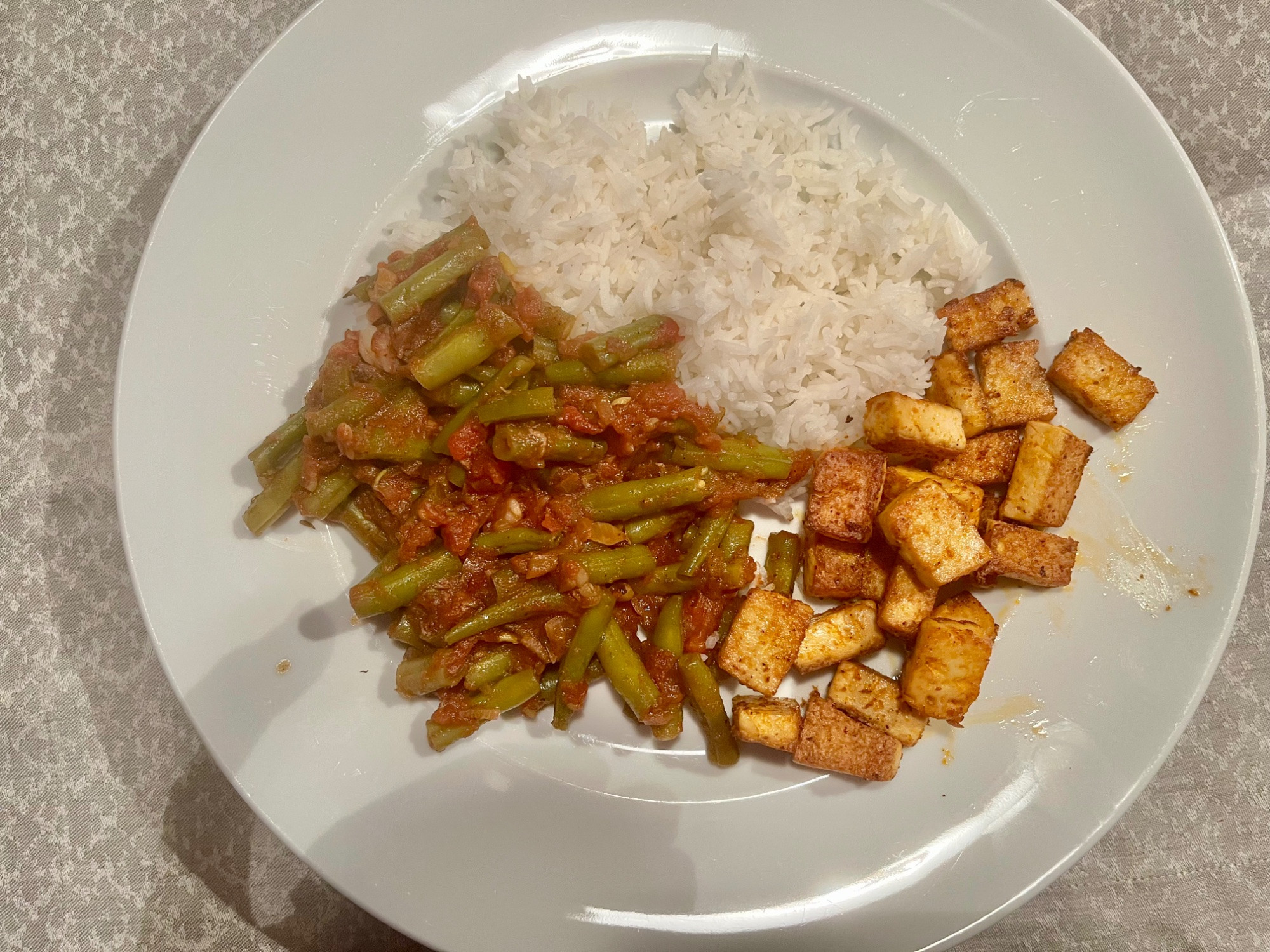 Hier gab es langsam gegarte grüne Wegmussbohnen in Tomatensauce nach Ottolenghi mit Basmati und Tofu.
