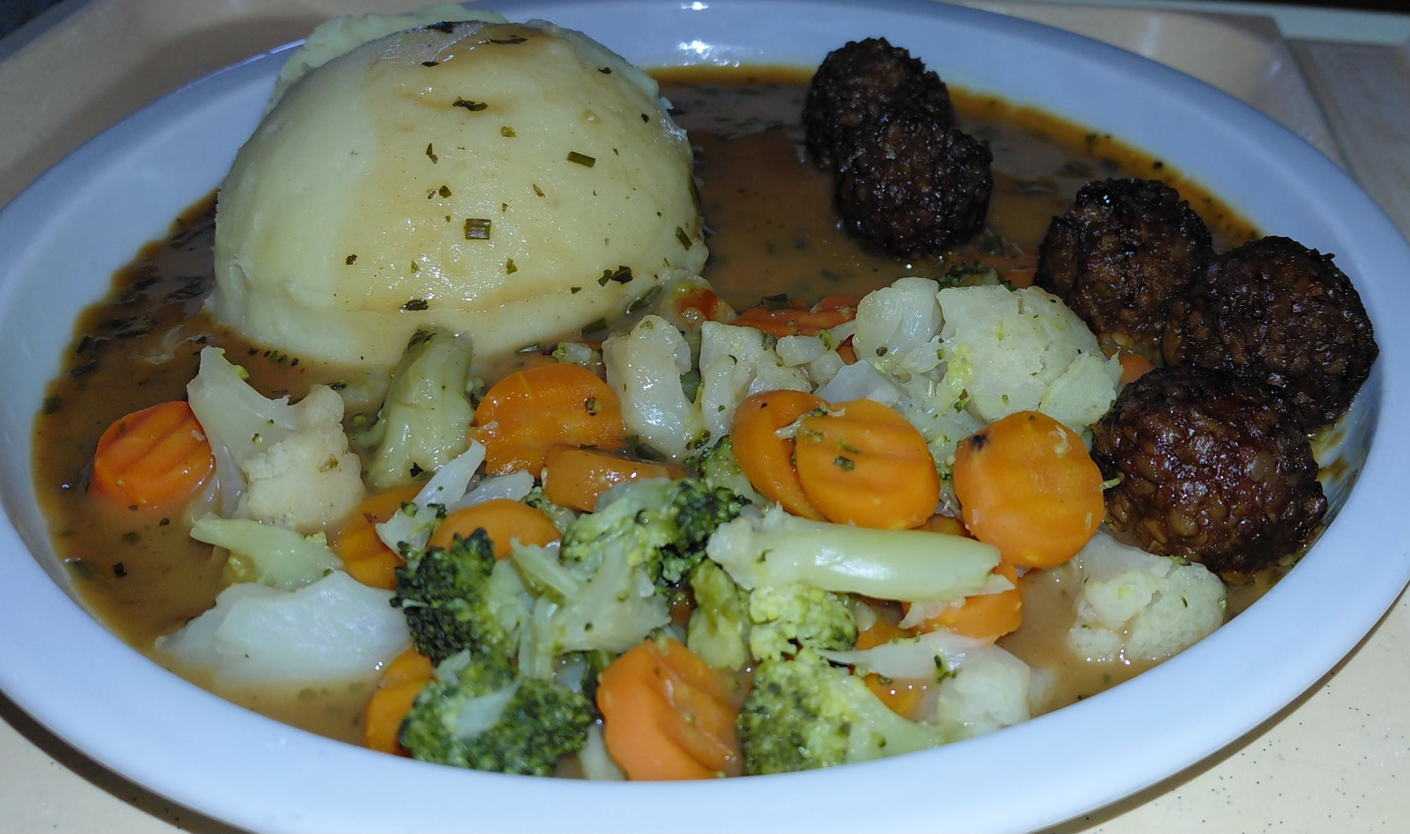 Krankenhausessen: veg. Frikadellen, Kaisergemüse, Kartoffelpü, Kräutertee