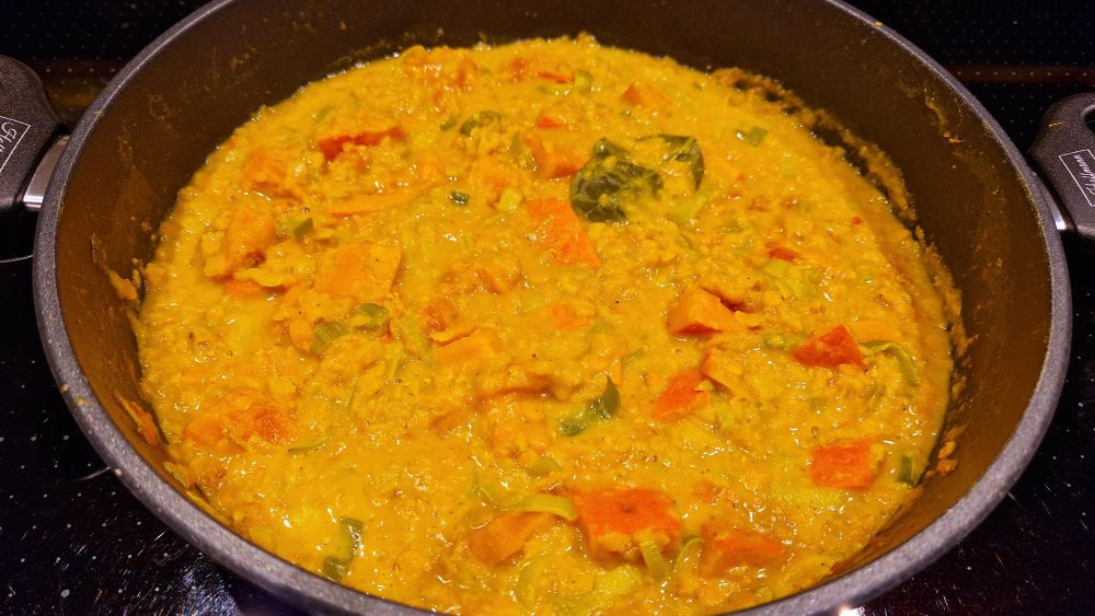 Hier gab´s Curry mit Kürbis und roten Linsen, dazu Fladenbrot.