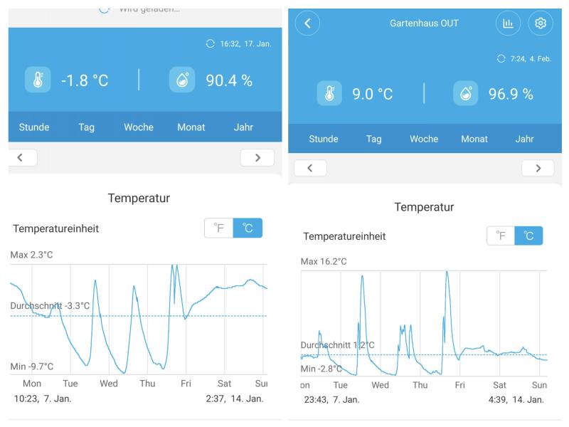 Draußen nutze ich zwei Bluetooth Thermometer/Hygrometer von Govee, die ich im Doppelpack spontan günstig erstanden hatte. Die Auflösung und Darstellung ist tatsächlich ganz gut aber ich muss mir die Daten immer manuel ziehen. Drinnen im Keller und auf dem Dachboden nutze ich Shelly. Die gerade hängen am Strom und nutzen WLAN. Von der Darstellung und Auflösung aber nicht so gut. (Siehe Bild)