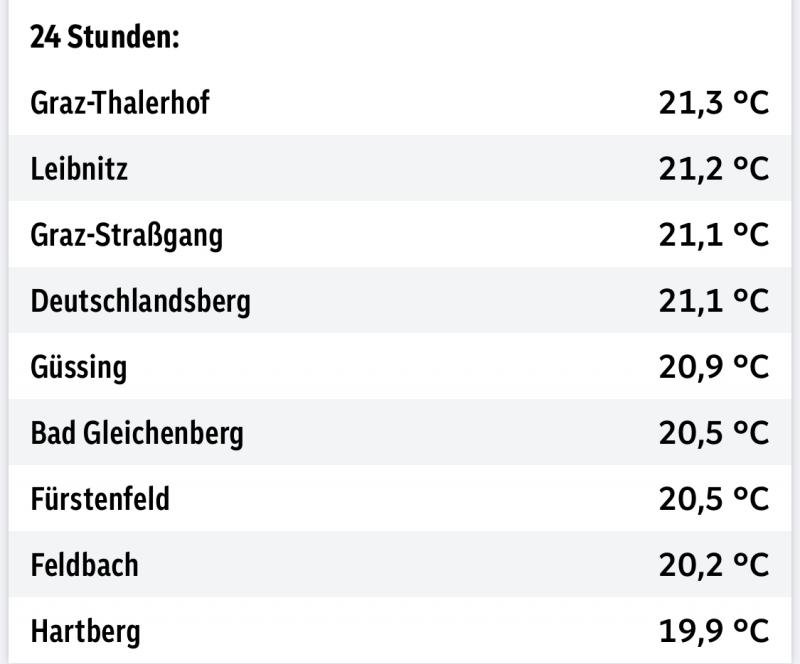 Heutiges Temperaturmaximum: 21,3 Grad in SO-Österreich.