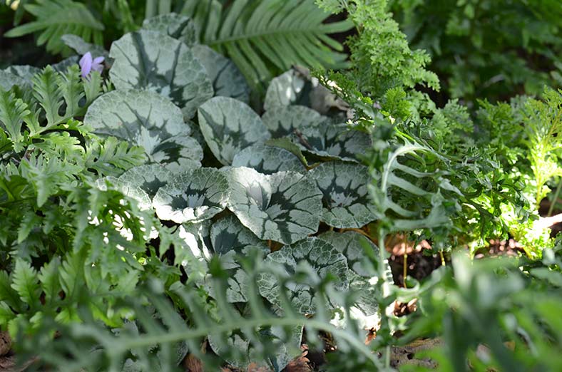 Sehr schönes Laub! Hier ist bisher noch kein Blatt zu sehen, die Blüte beginnt gerade, hier Cyclamen graecum f. album.