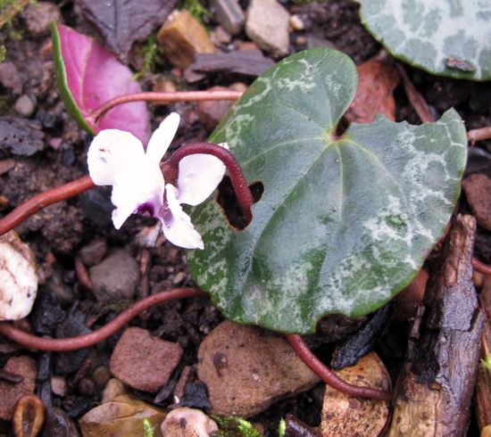 Cyclamen x meiklei blüht zum ersten Mal. Leider bekomme ich die 3 Blüten und die dreieinhalb Blätter nicht sinnvoll auf ein Bild.