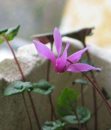 Heute ist das zweite meiner beiden Cyclamen x meiklii aufgeblüht. Das silbrige Blatt gehört dazu. Die andere Pflanze hatte ganz blasse Blüten, eher noch kleiner.