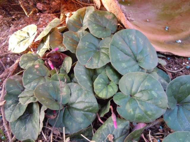 Das Blatt ist weniger langgestreckt als bei den meisten C. hederifolium, die Artzugehörigkeit aber eindeutig. Anfangs habe ich die zentrale Rötung der Blätter für ein Krankheitssymptom gehalten...