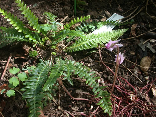 Die ersten C. hederifolium blühen. Hier mit Blechnum spicant.