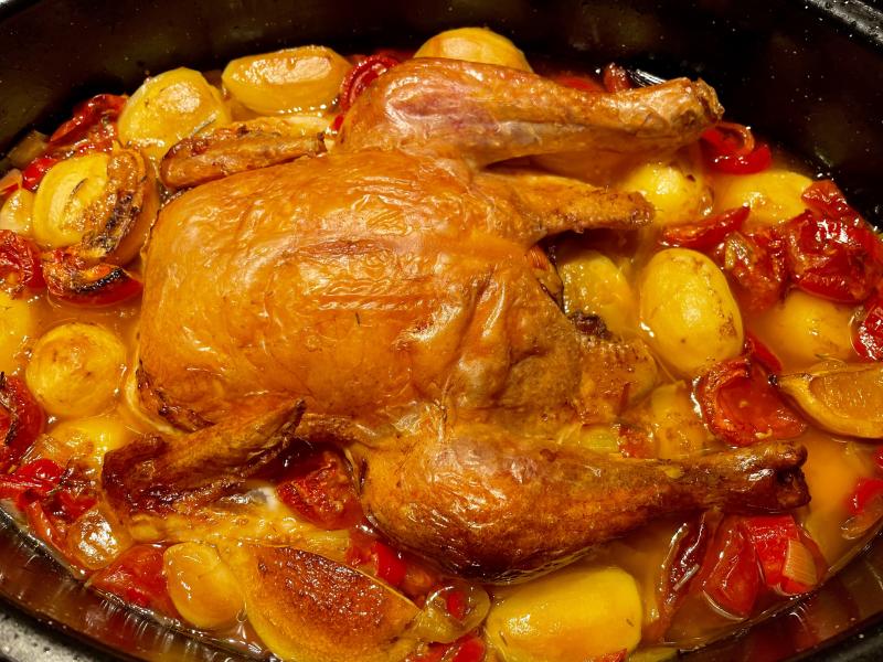 Ja, die Hähnchen sehen wundervoll aus! Ich mach immer entweder knusprig mit Hähnchen auf dem Rost und Gemüse darunter im tiefen Backblech ohne Übergießen, oder Coque au vin mäßig mit Flüssigkeit aber dann ohne knusprig. Bei Zwerggarten geht ja offenbar beides gleichzeitig :P