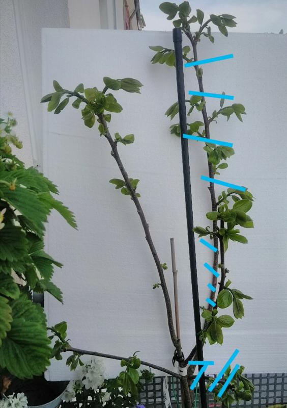 Alles, was blau markiert ist, habe ich weggeschnitten. Es. War. Viel. Ein Gemetzel. Aber die tiefen Äste hätten auf Dauer am Balkon keinen Platz mehr gehabt, ich versuche, die Krone über "Balkongeländerniveau" zu bekommen. (Ein paar kleinere Äste habe ich ja schon vorher entfernt gehabt, jetzt eben die Doppelspitzen)