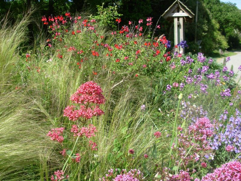 Anschliessend (Juli) blühen Achillea filipendula, Veronica longifolia, Gaura und Verbene bonariensis, im Hintergrund Strauchmalven.