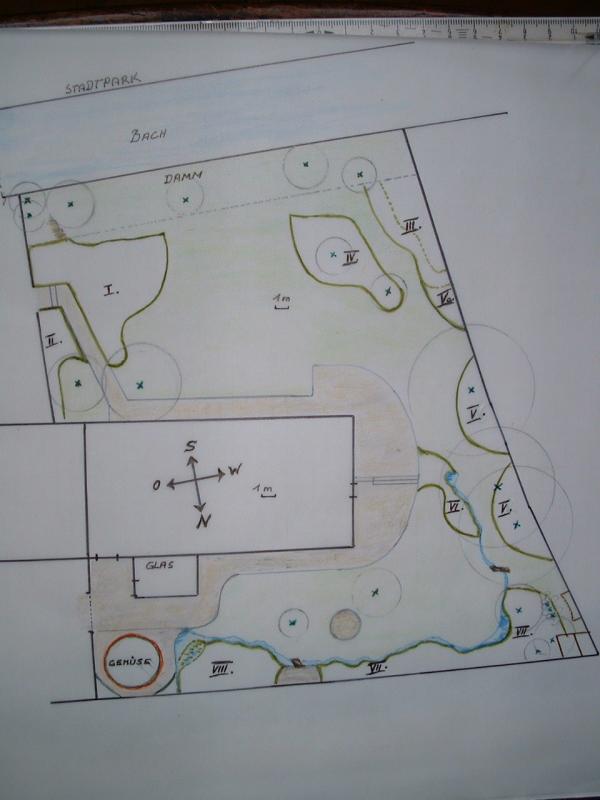 Kein Wasseranschluß, kein Brunnen, Regenwasser wird gesammelt und ich kann bis zu 12.000Liter speichern. Es wird gezielt mit Gießkannen gewässert. Es befindet sich in mehren Metern Tiefe eine wasserführende Schicht. Gehölze mit starkem Wurzelwachtum, können diese Schicht nach einigen Jahren erreichen.