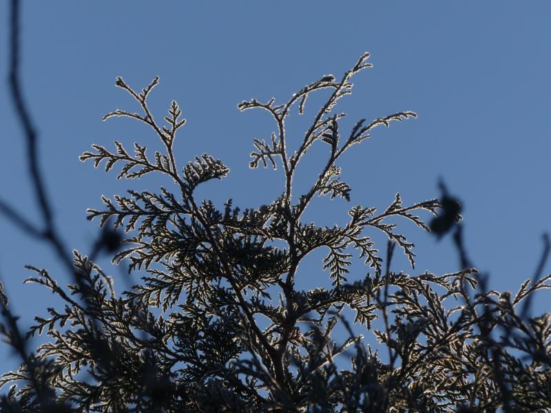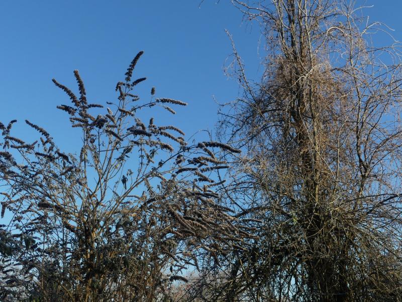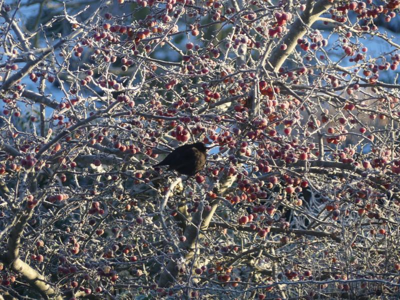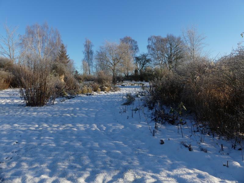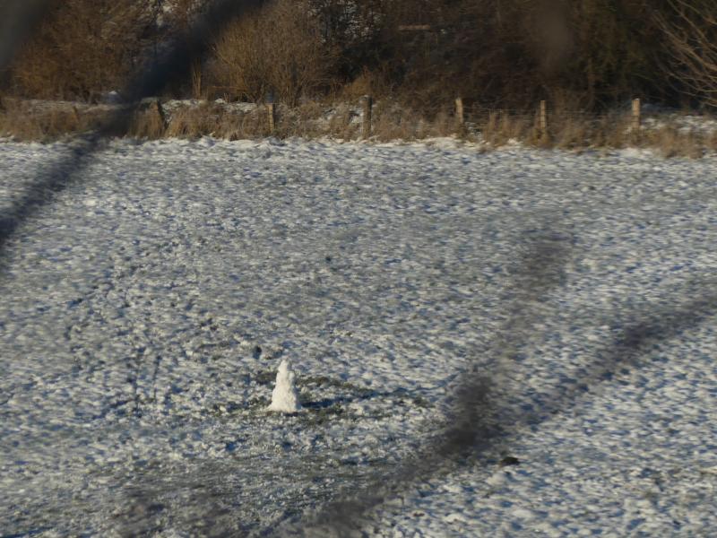 Auf der anderen Hausseite habe ich einen Blick zum Ort hin und rechts zur Koppel und den Waldrand.Die Kinder hatten Schneemänner gebaut.