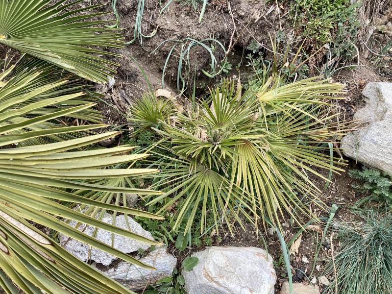 Eine kleine Chamaerops humilis hat ihren ersten Winter ausgepflanzt gut überstanden... hier war kein Schutz notwendig.