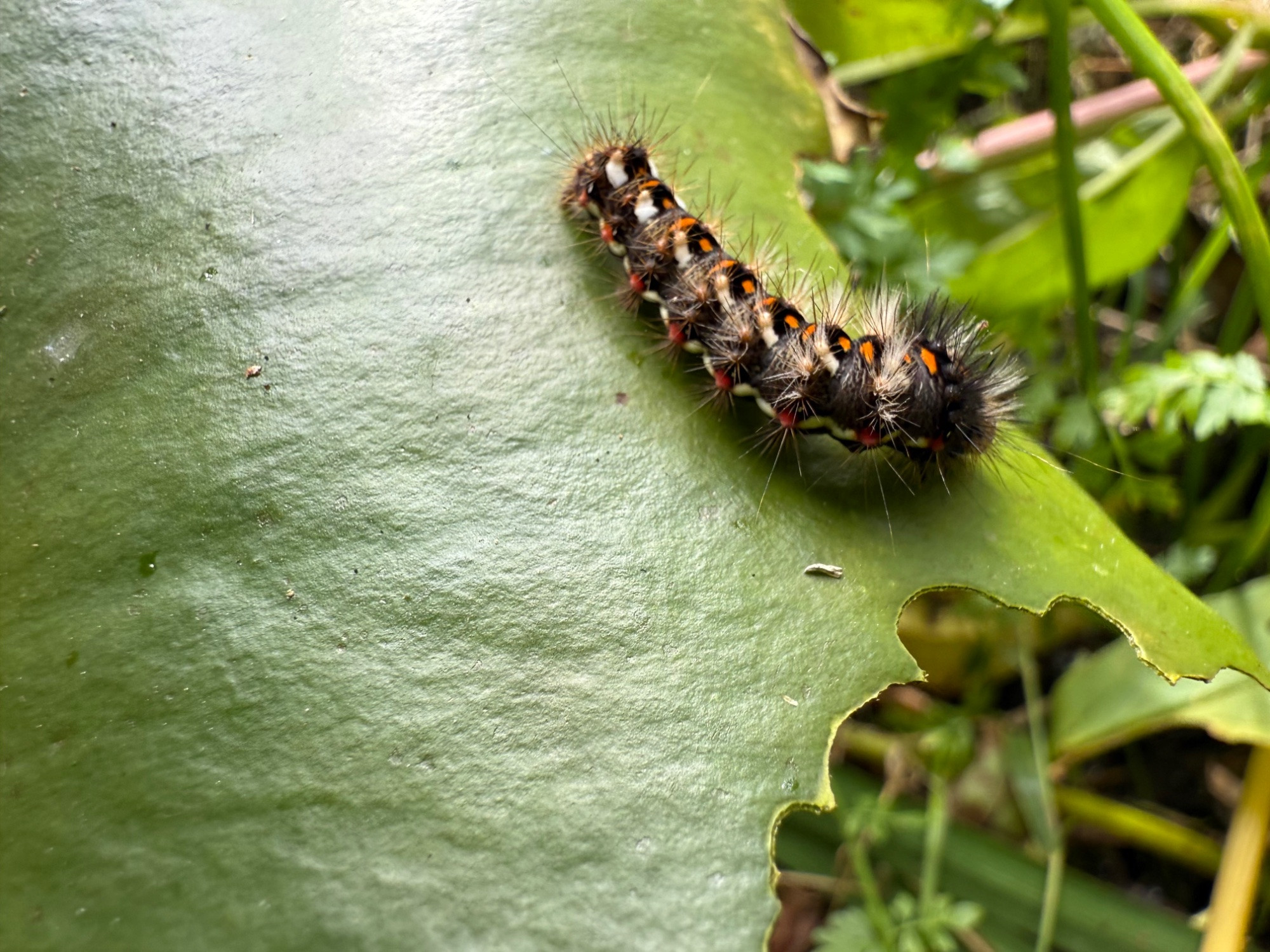 Ich konnte die Raupe zwar nicht direkt beim Fressen beobachten, aber die frischen Fraßspuren in ihrer unmittelbaren Nähe deuten stark darauf hin, dass sie die Verursacherin ist. Allerdings bin ich mit dem spezifischen Fraßbild der Ampfereule nicht vertraut, um das sicher beurteilen zu können. Aber da ich sie erst kürzlich an der Bergminze entdeckt habe, überrascht mich eigentlich gar nichts mehr.