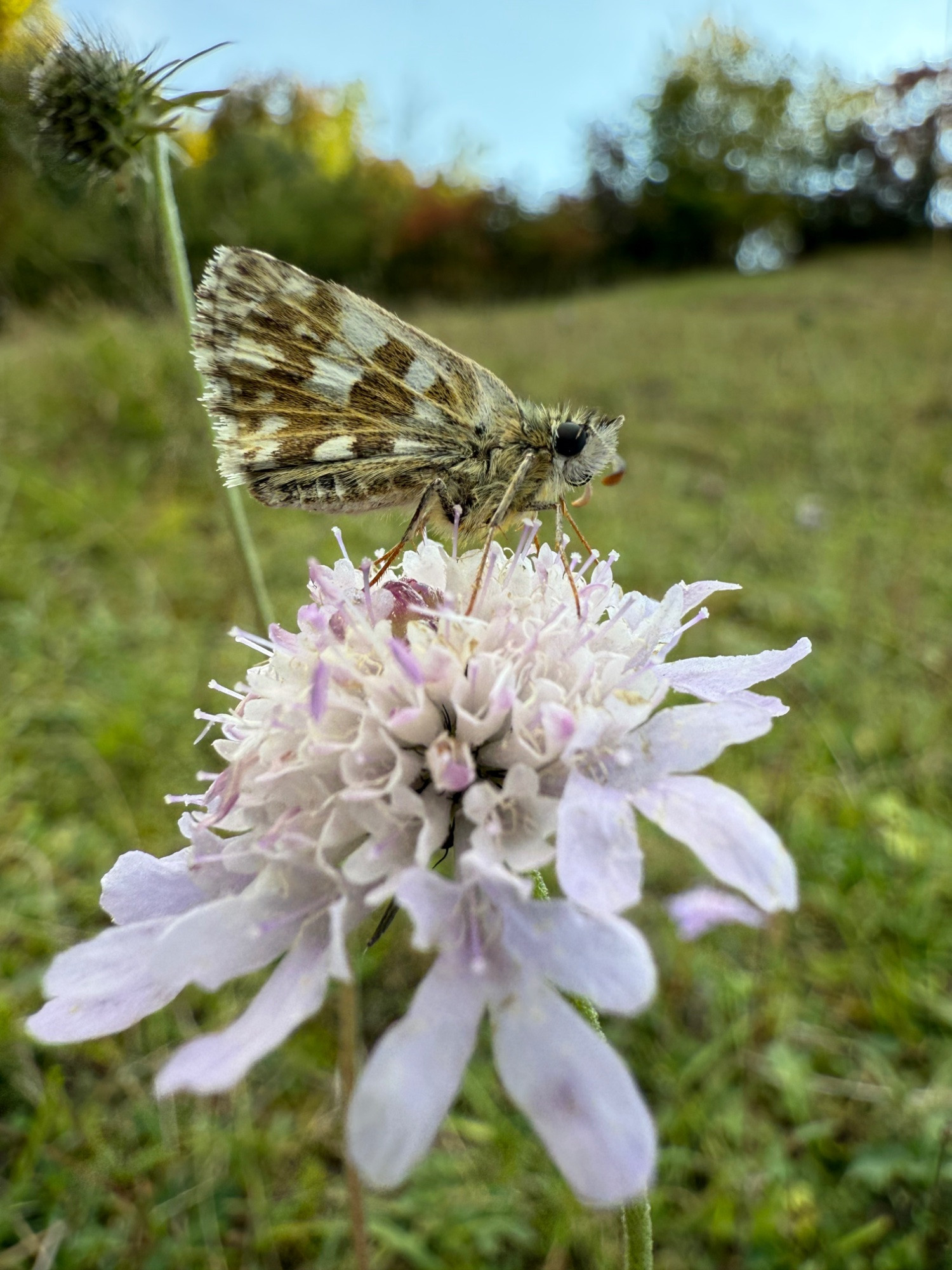 Das hier ist einDickkopffalter der Gattung Pyrgus . Aufgrund des Aussehens gehe ich davon aus, dass es sich um den Zweibrütigen Würfel-Dickkopffalter (Pyrgus armoricanus) handelt. Diese Art ist in Deutschland auf der Roten Liste als "gefährdet" (Kategorie 3) geführt. Lokal kann die Gefährdungssituation jedoch deutlich kritischer sein, sodass er in einigen Bundesländern als "stark gefährdet" oder sogar "vom Aussterben bedroht" gilt.