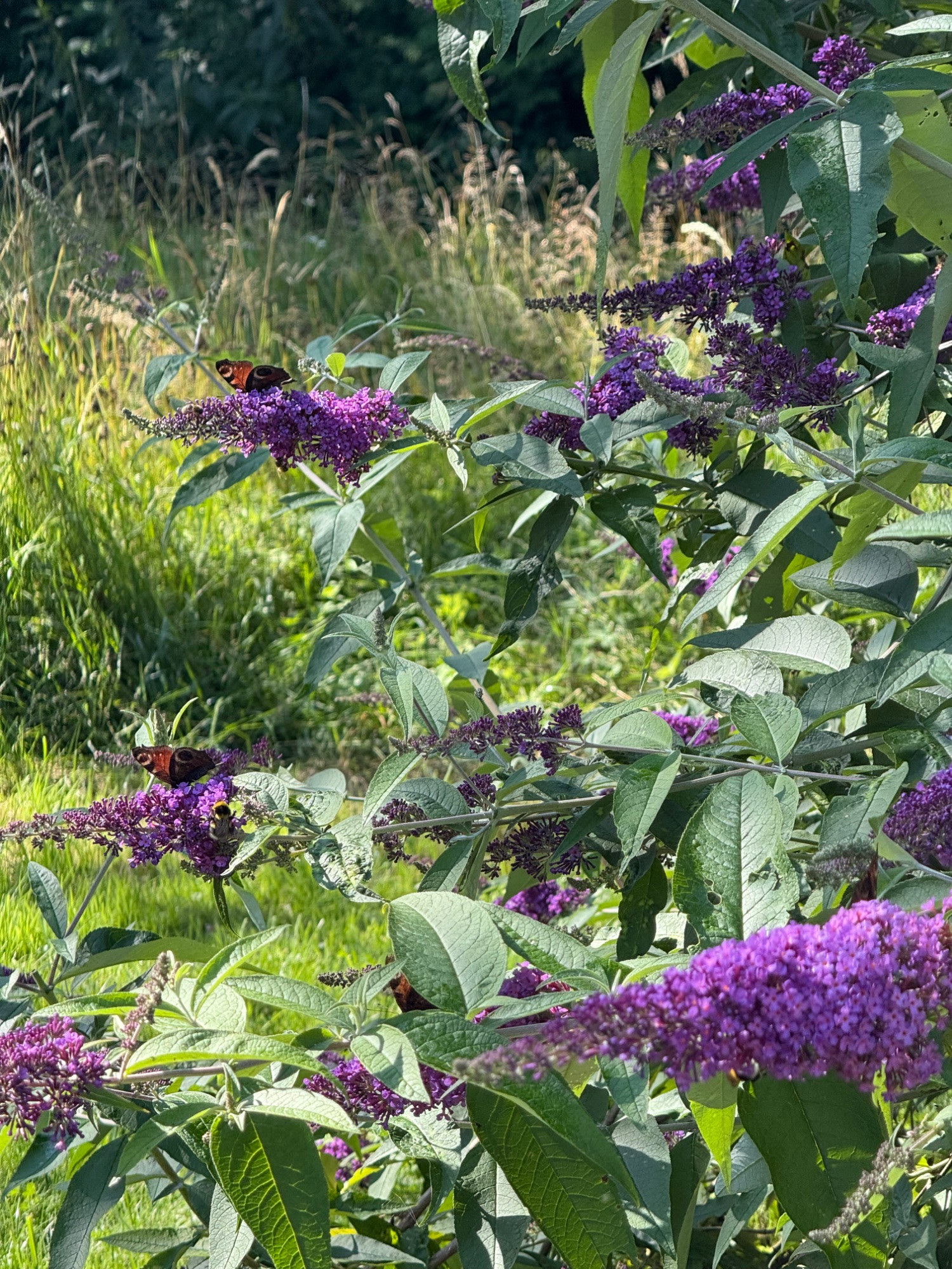 Der Grauschnäpper ist zwar kein Falter, aber aktuell ein Schmetterlingsvernichter. Und zeigt ein Problem des Schmetterlingsflieders auf, dessen Sogwirkung für eine hohe Konzentration an Faltern sorgt und der Vogel damit leichtes Spiel hat. Er setzte sich gern auf den Sonnenschirm, um sich dann auf Schmetterlinge zu stürzen, die kurz vor der Landung waren oder gerade losgeflogen sind. Insbesondere große Falter wie die Tagpfauenaugen waren sehr beliebt beim ihm. Auf ruhende Schmetterlinge, die auf der Blüte saßen, hat er es nicht abgesehen – vermutlich ein unnötiges Risiko, falls sich doch mal eine Katze im Gebüsch versteckt.